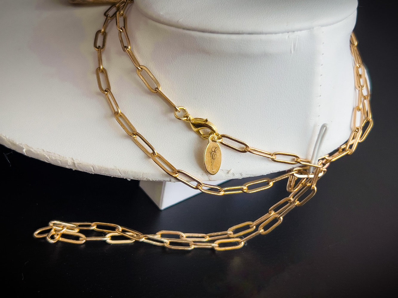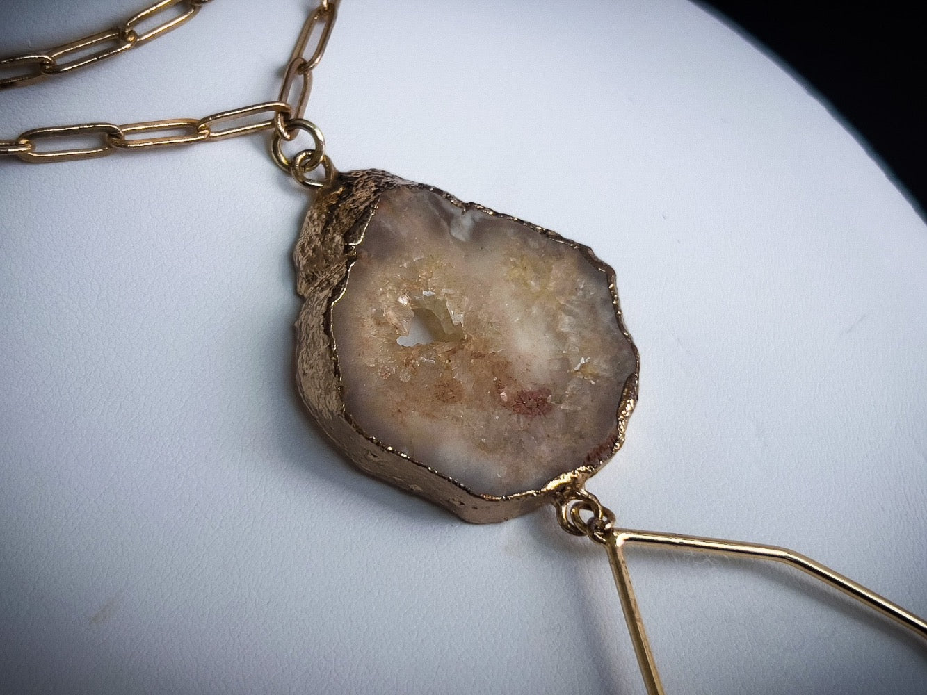 Lisa Brito's handcrafted long gold plated necklace with stunning quartz slice pendant and elegant dangling marquise shaped metal loop.