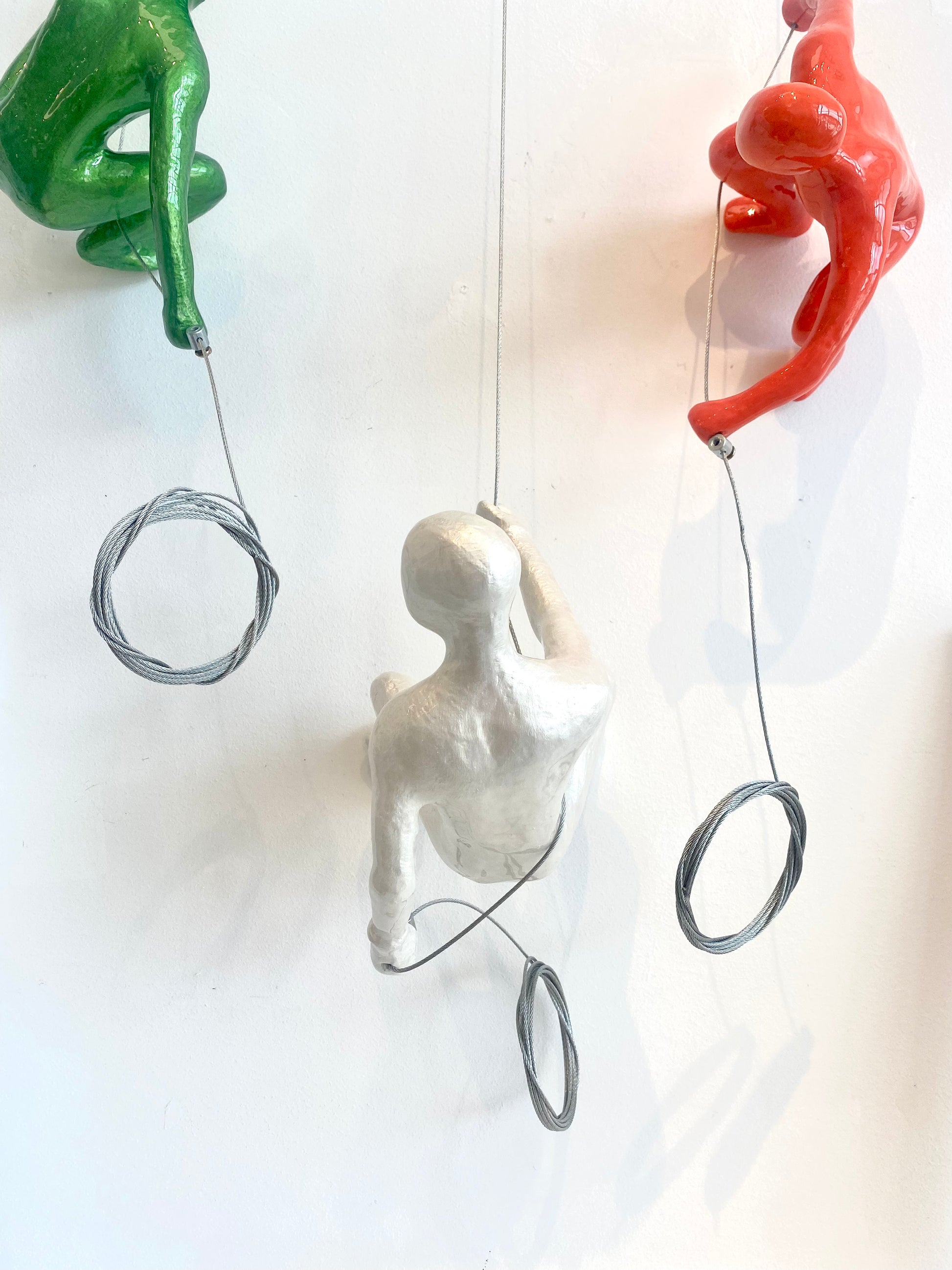 Ancizar Marin, "White Climber", 10 x 4.5 x 6 inch fiberglass, volcano rock and bronze sculptures finished with white automotive paint. This piece is completely hand crafted and one of a kind with Marin's signature, and represents a rock climber or acrobat climbing up or repelling from the surface of the wall.