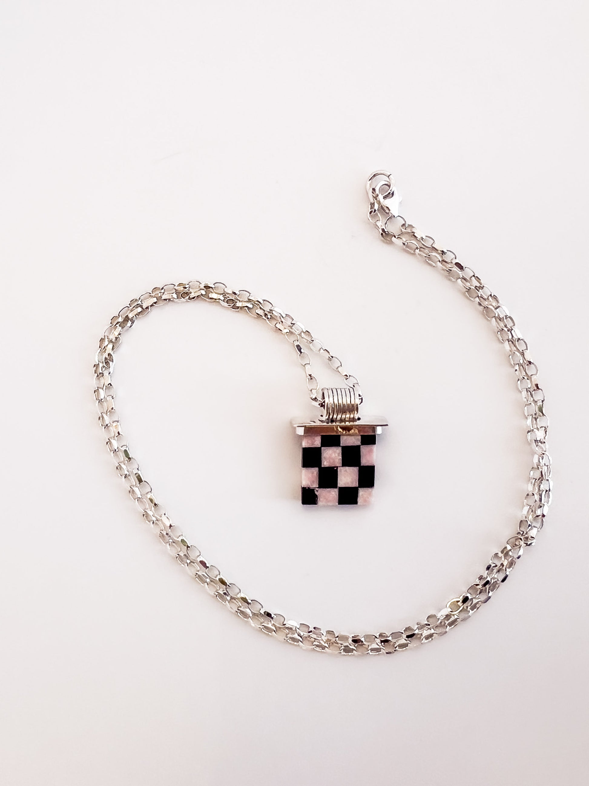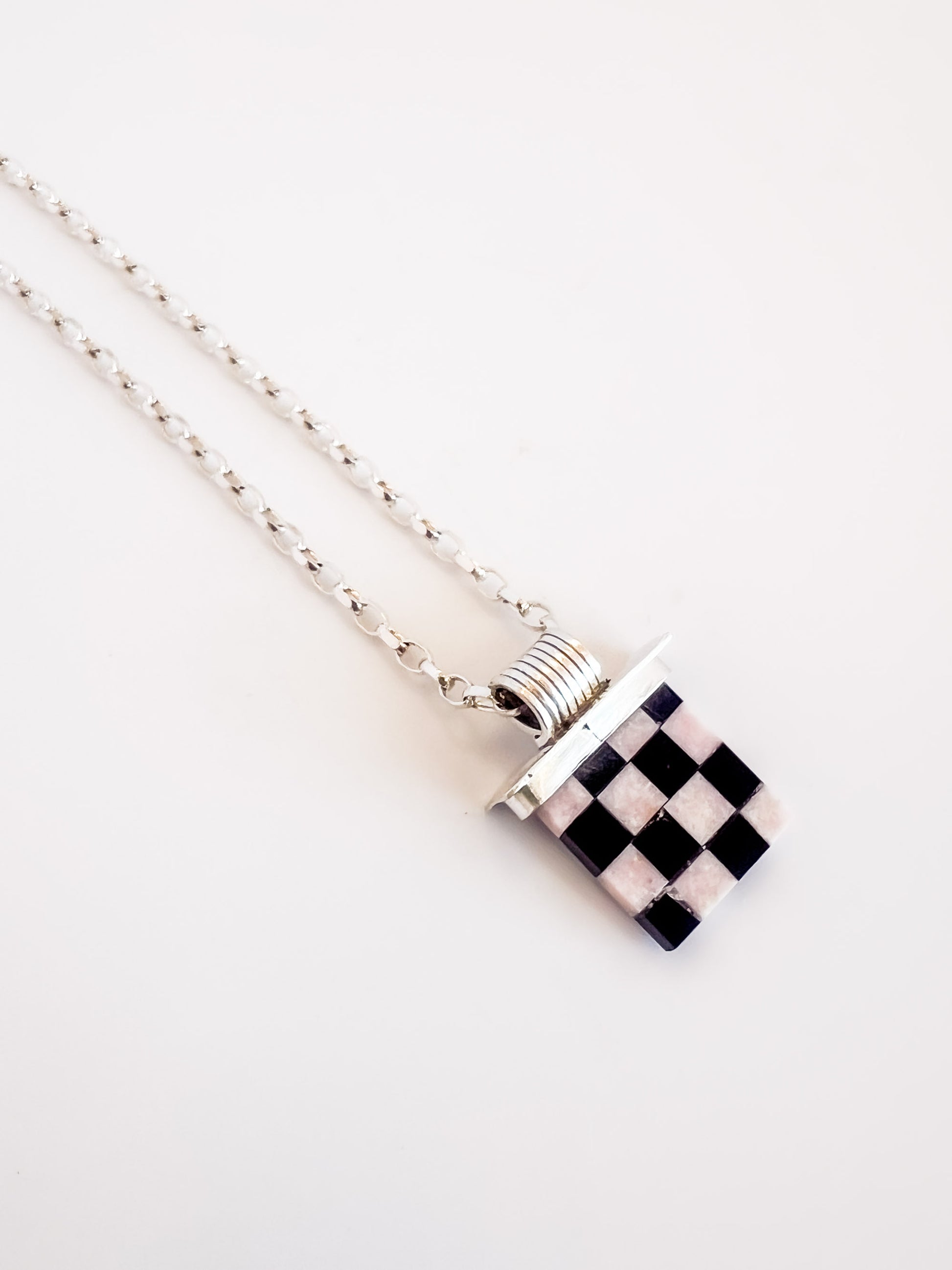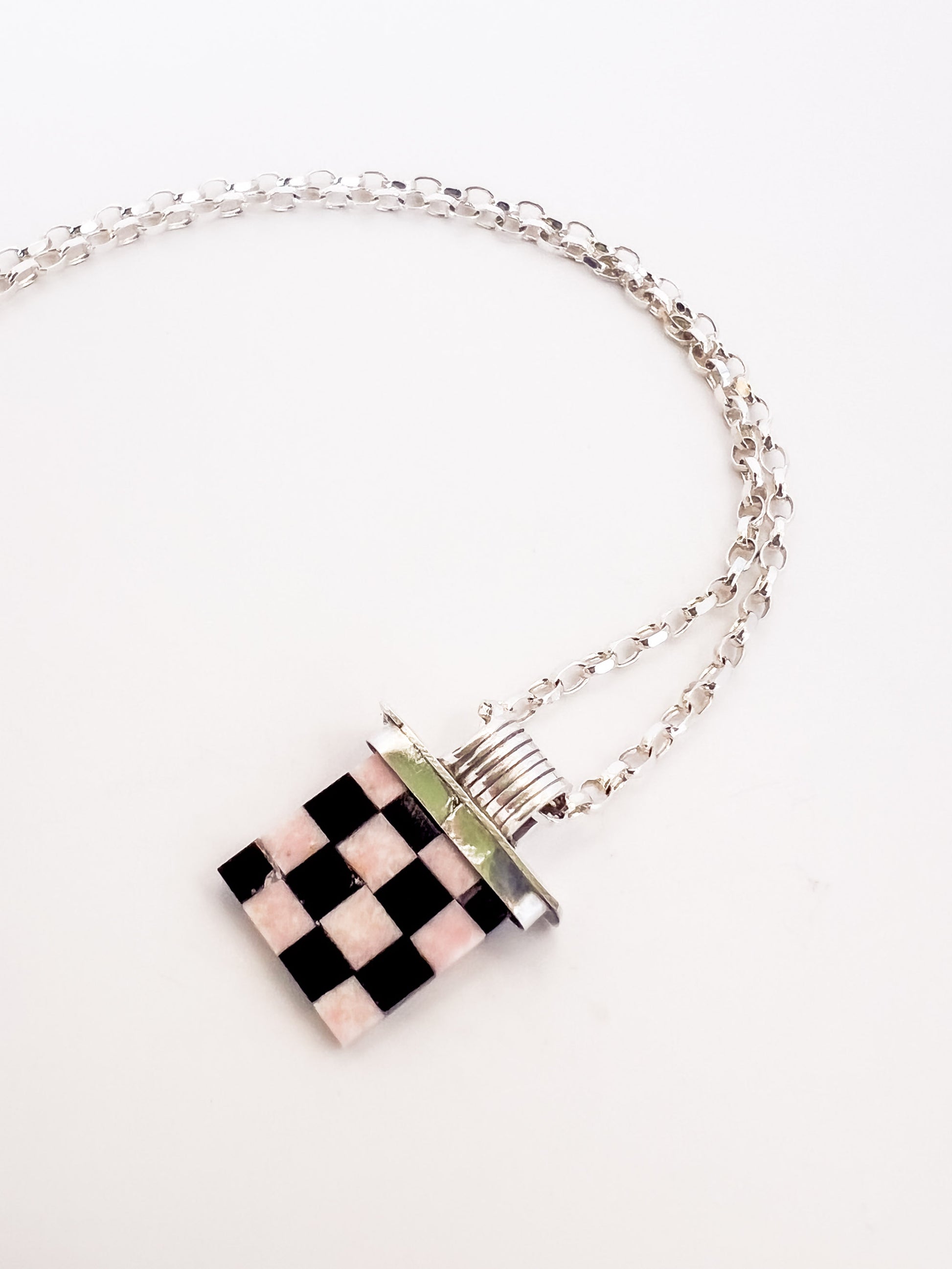 Sterling Silver and Intarsia Cabochon necklace by Mary Wentzel. Handcrafted with black onyx and pink jade, the artist creates a unique checkered pattern.