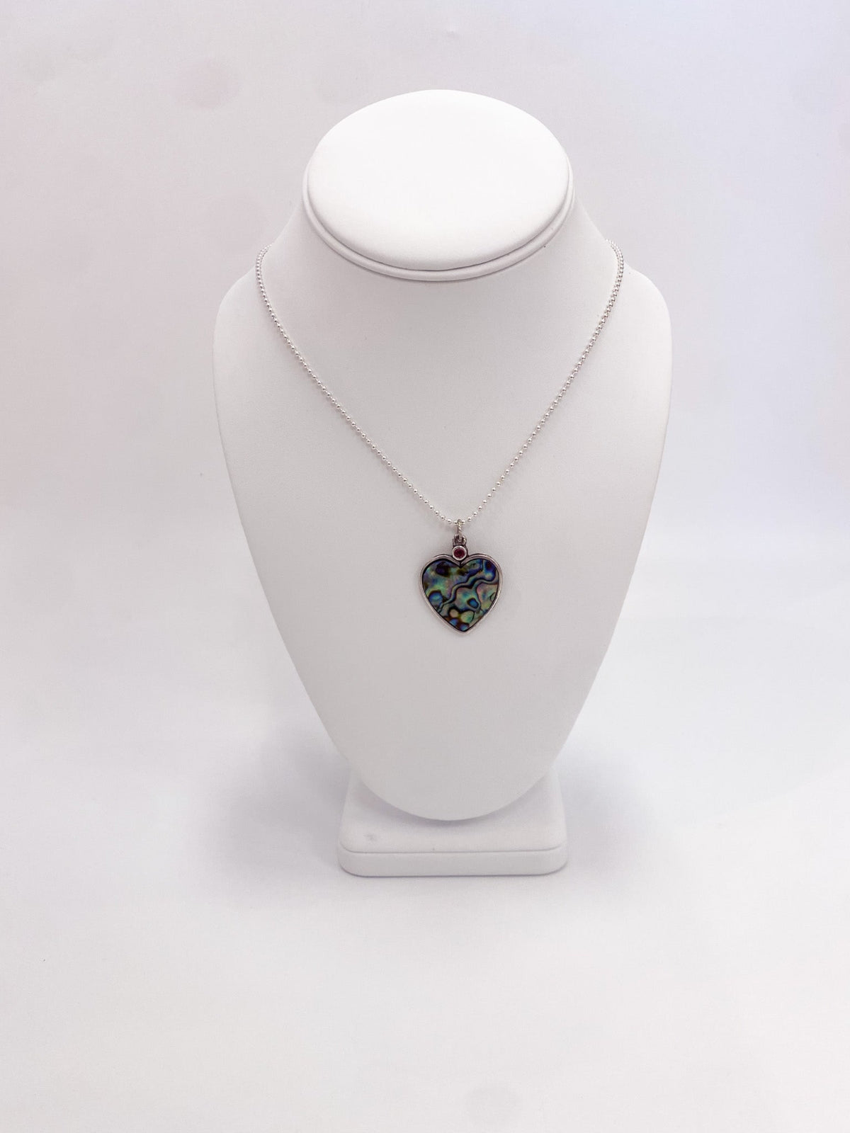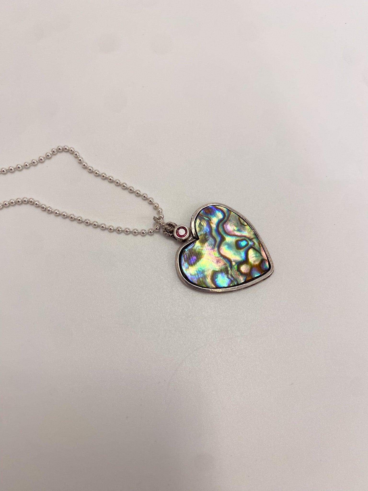 Heart shaped pendant by Cathy Miller. Made with abalone, the heart pendant is accented by a 4mm pink tourmaline and sterling silver chain. Enjoy the shimmer with this necklace.