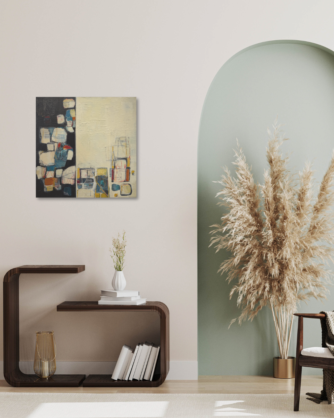 24" x 24" original mixed media by Elizabeth Bhimjee. The artist is a member of the Florida Women's Arts Association (FLWAA). This work is part of Gallery500's exhibition "50 Shades of Payne's Grey." In this exhibition, FLWAA members interpret the versatile color of Payne's Grey through their own individual lens and media.
