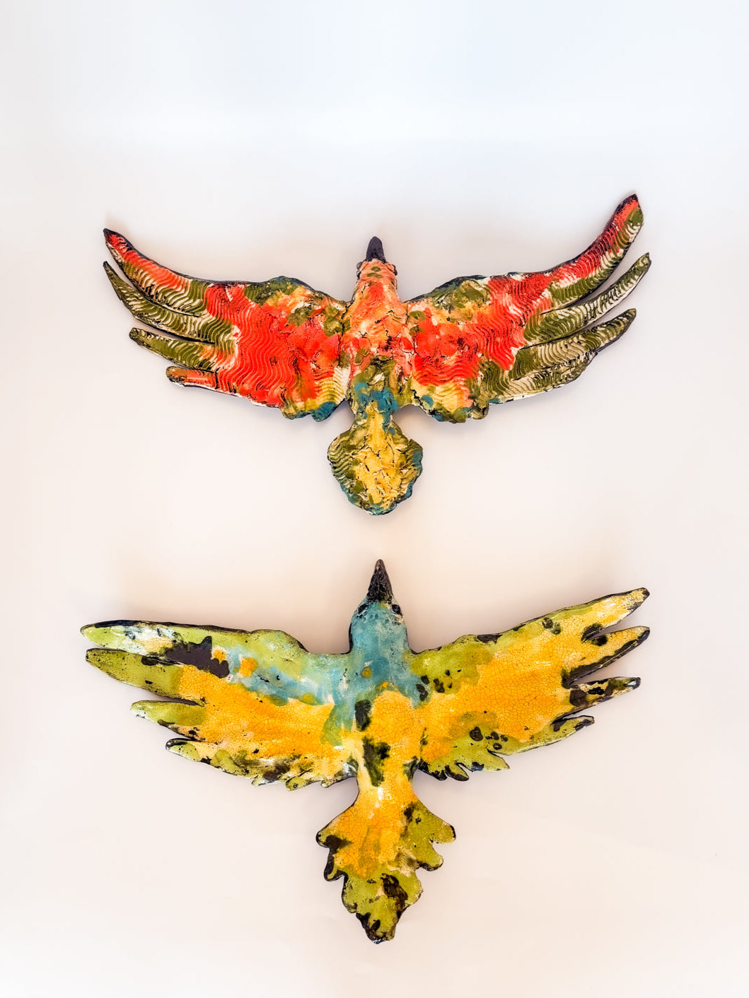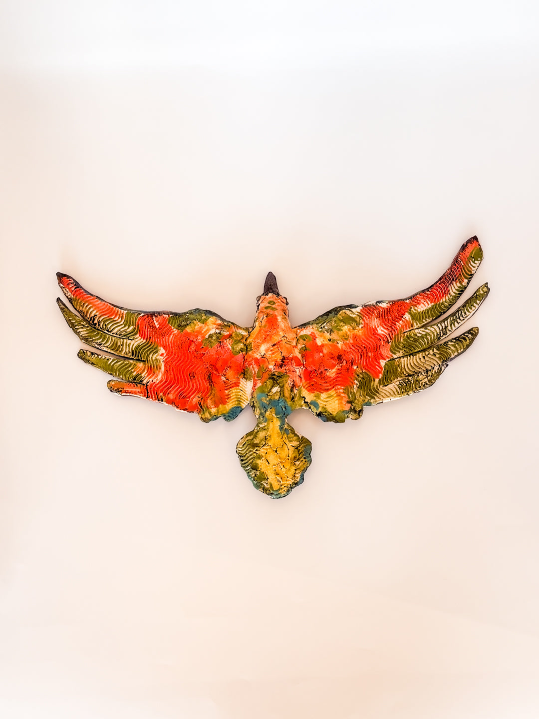 16" x 11" x 3" clay sculpture by Julie Latayan. This richly textured ceramic wall sculpture is hand-shaped and painted in bold, earthy tones of ochre, crimson, moss green, and charcoal. The layered glaze application gives the piece an almost abstract quality, while still evoking the unmistakable silhouette of wings in motion. A one-of-a-kind piece that brings nature’s vibrancy and freedom indoors—perfect for collectors of modern folk art or nature-inspired decor.