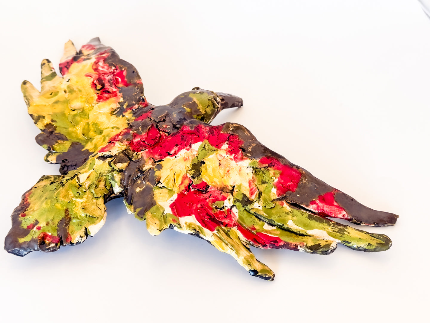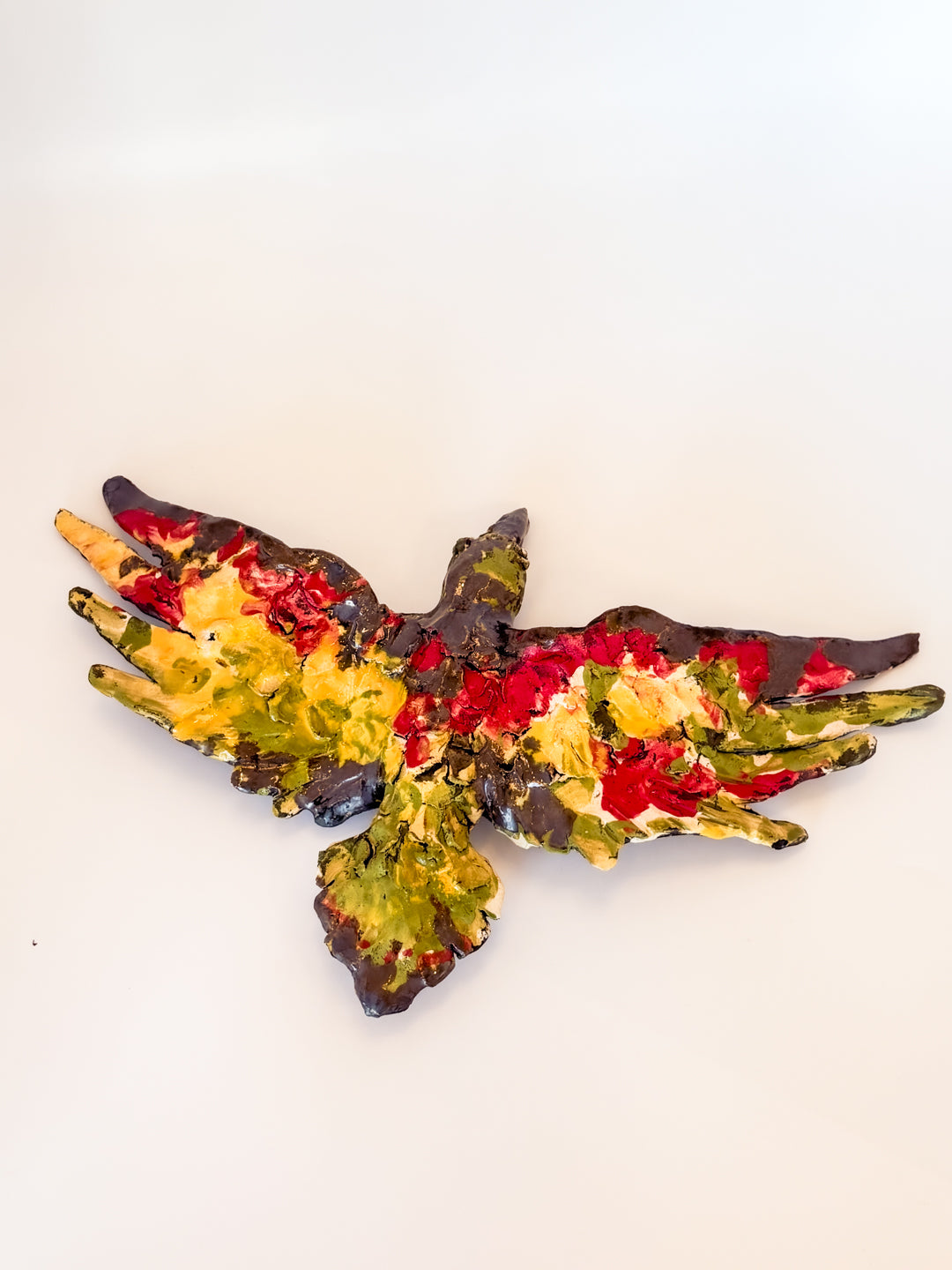 16" x 11" x 3" clay sculpture by Julie Latayan. This richly textured ceramic wall sculpture is hand-shaped and painted in bold, earthy tones of ochre, crimson, moss green, and charcoal. The layered glaze application gives the piece an almost abstract quality, while still evoking the unmistakable silhouette of wings in motion. A one-of-a-kind piece that brings nature’s vibrancy and freedom indoors—perfect for collectors of modern folk art or nature-inspired decor.
