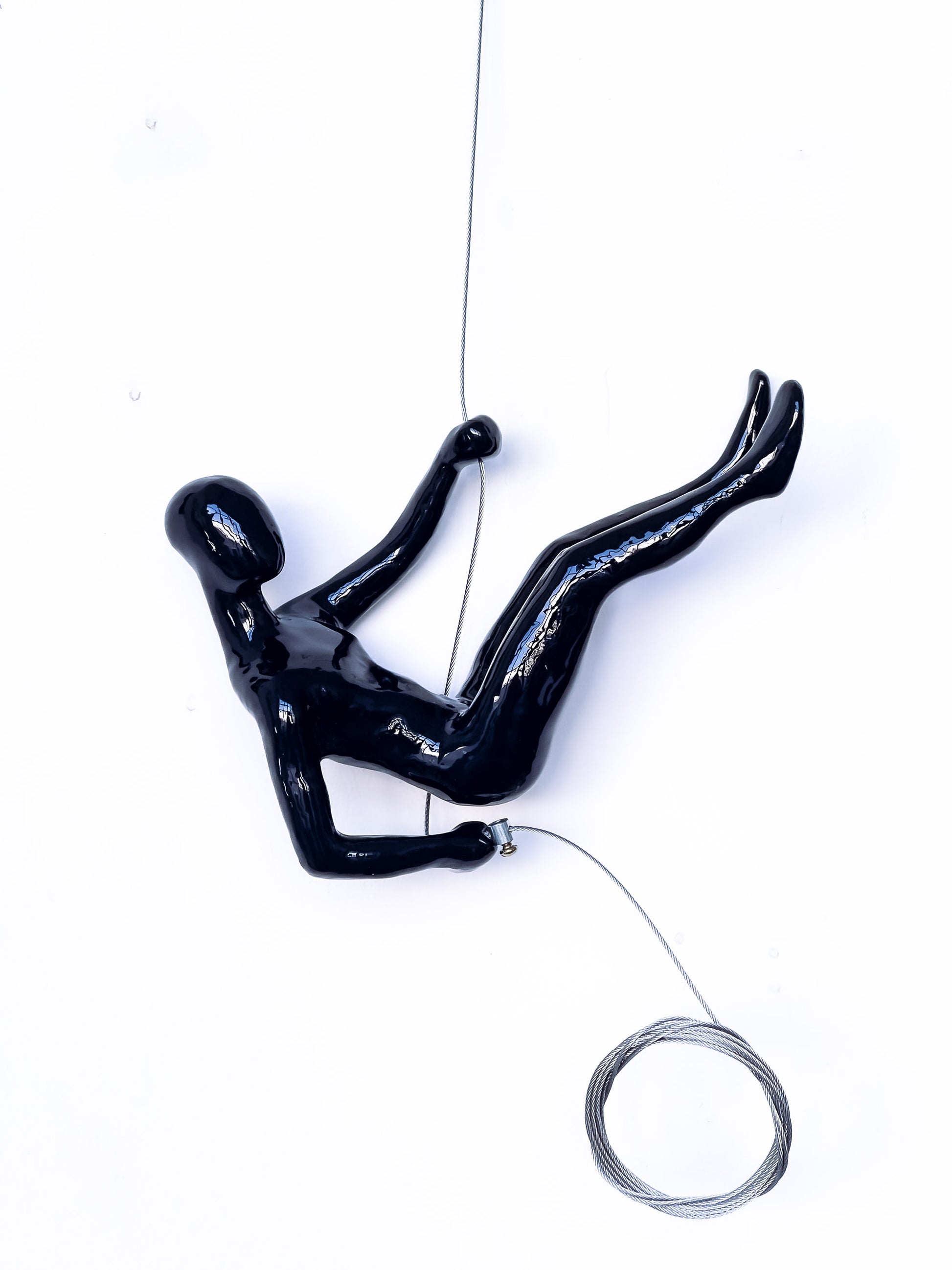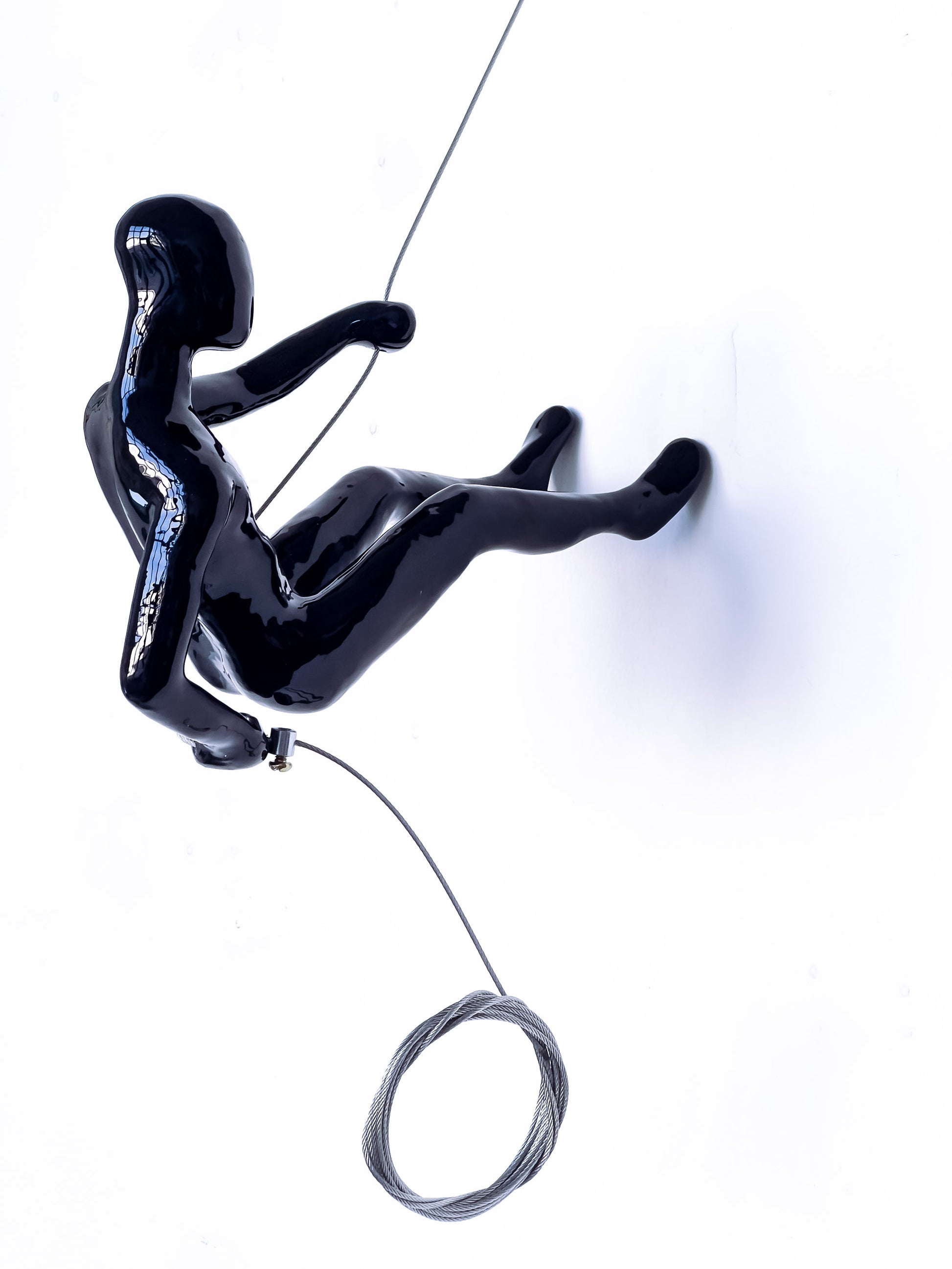 Ancizar Marin, 10 x 4.5 x 6 inch fiberglass, volcano rock and bronze sculptures finished with forest automotive paint. This piece is hand crafted and represents a rock climber or acrobat climbing up or repelling from the surface of the wall.