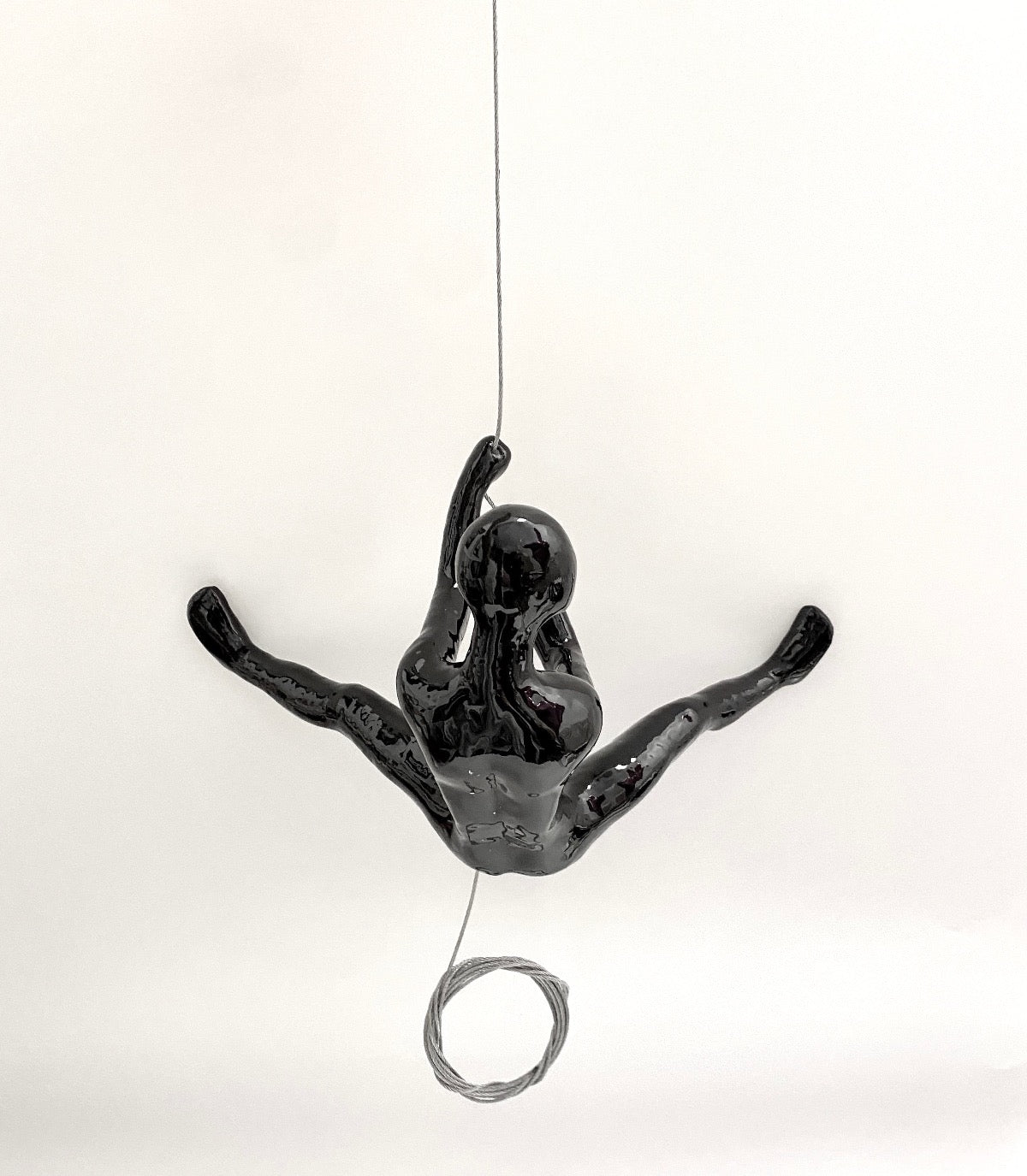 7.5 x 4 x 7.5 inch circus-inspired fiberglass, volcano rock and bronze sculptures finished with deep black automotive paint. This piece is completely hand crafted and one of a kind, and represents a rock climber or acrobat climbing up or repelling from the surface of the wall.