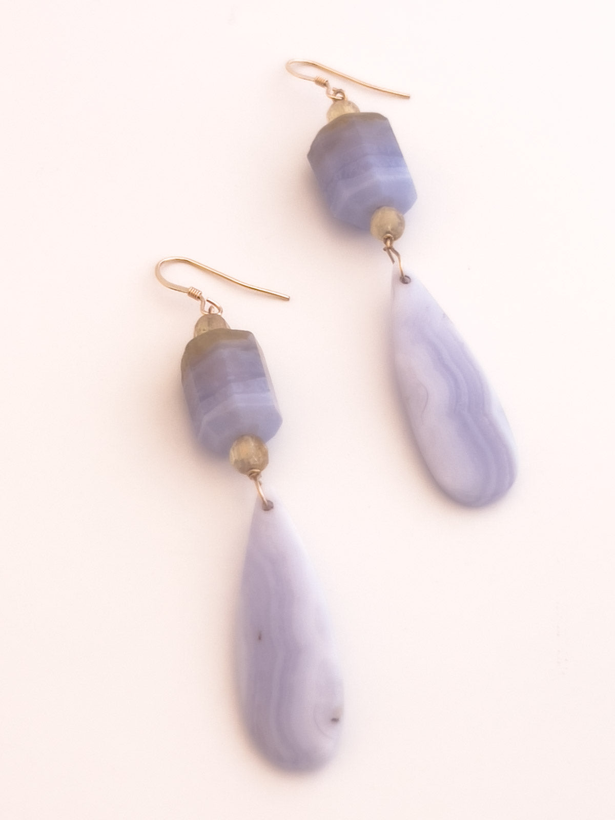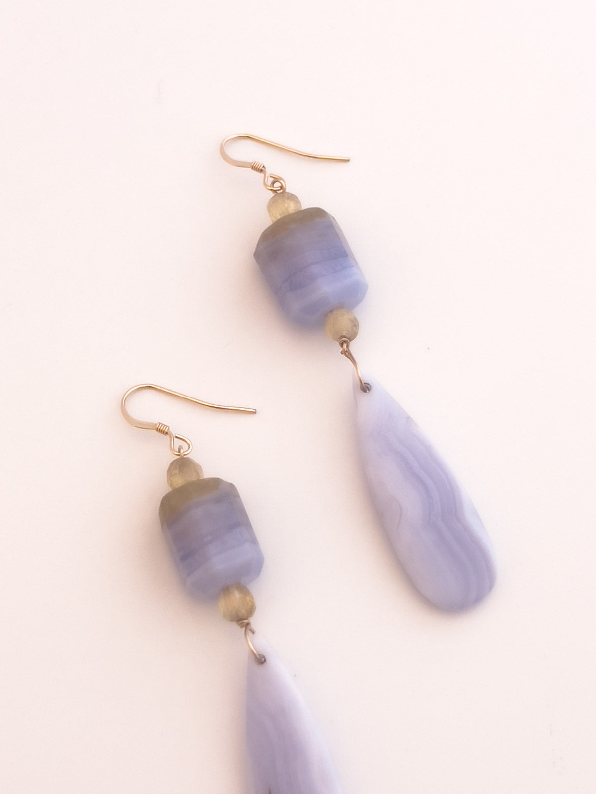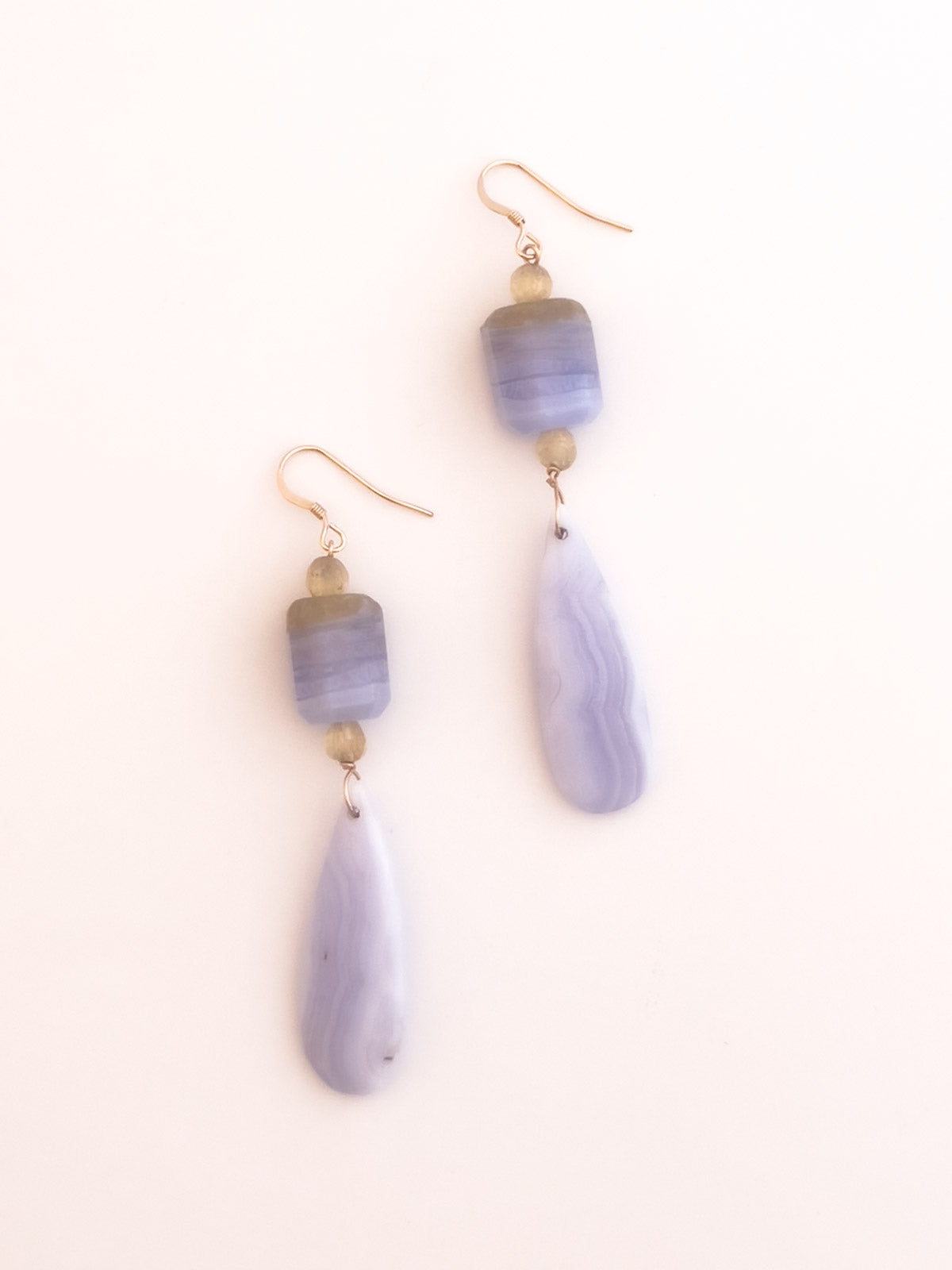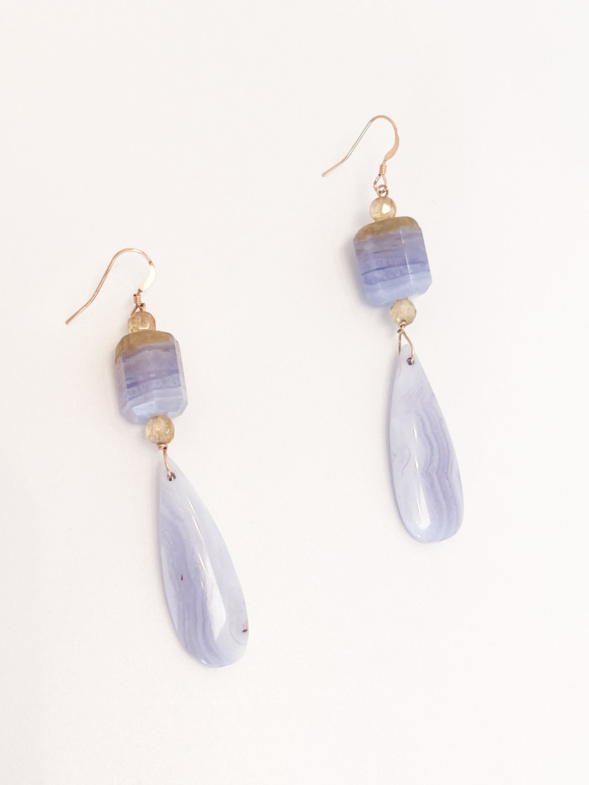 Blue lace agate earrings with golden rutilated quartz beads and gold filled findings by Cathy Miller. The light blue color these earrings evoke a sense of calm.