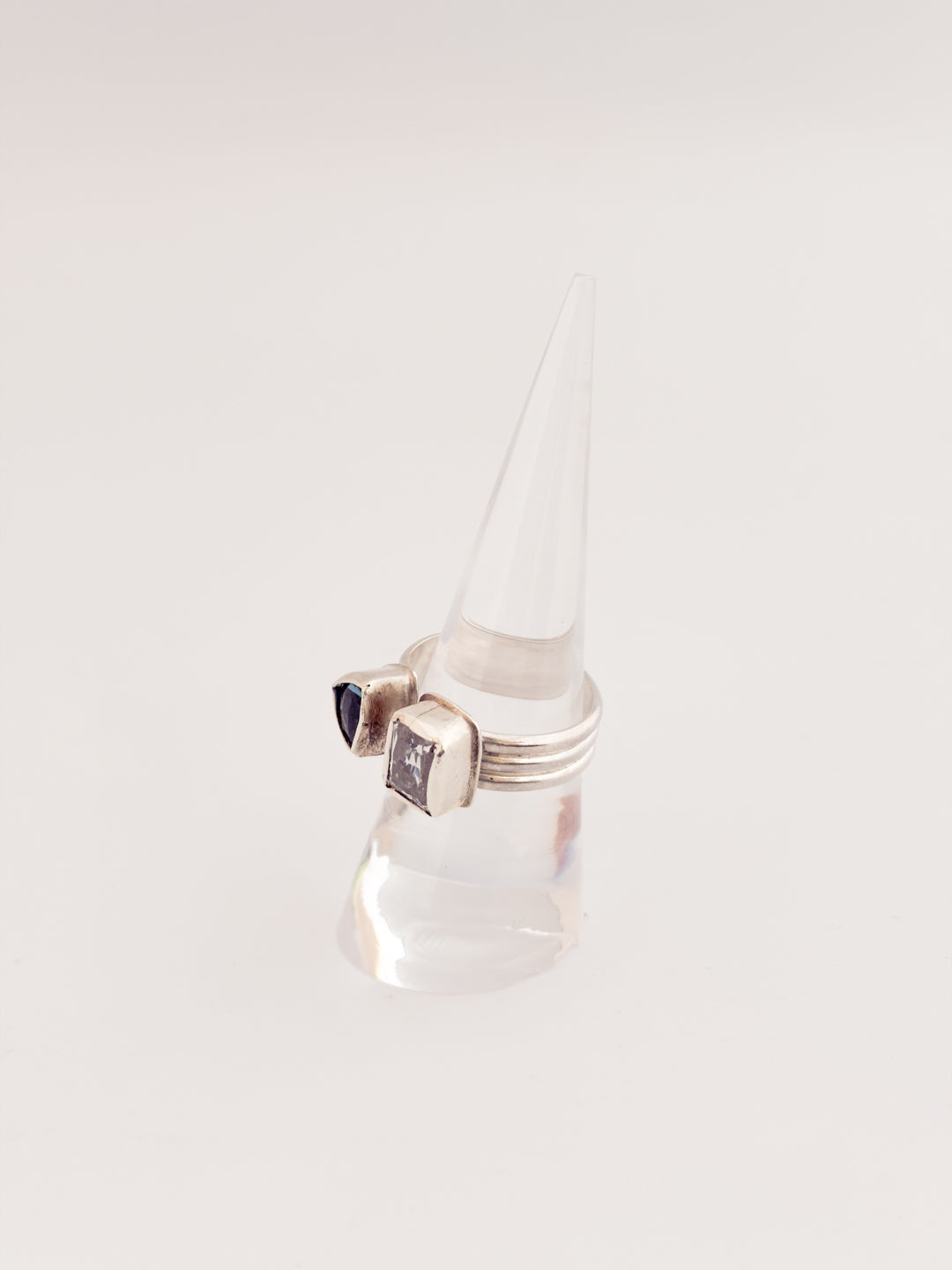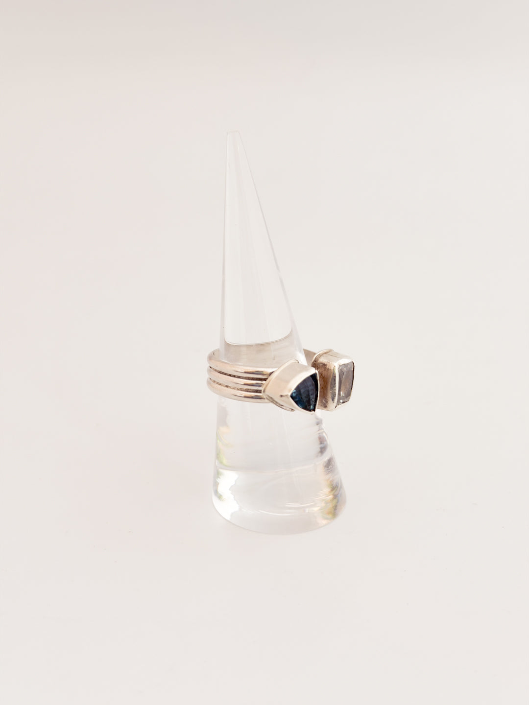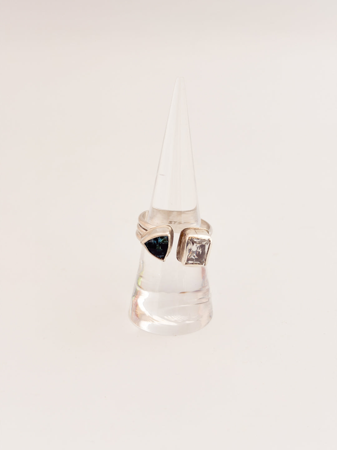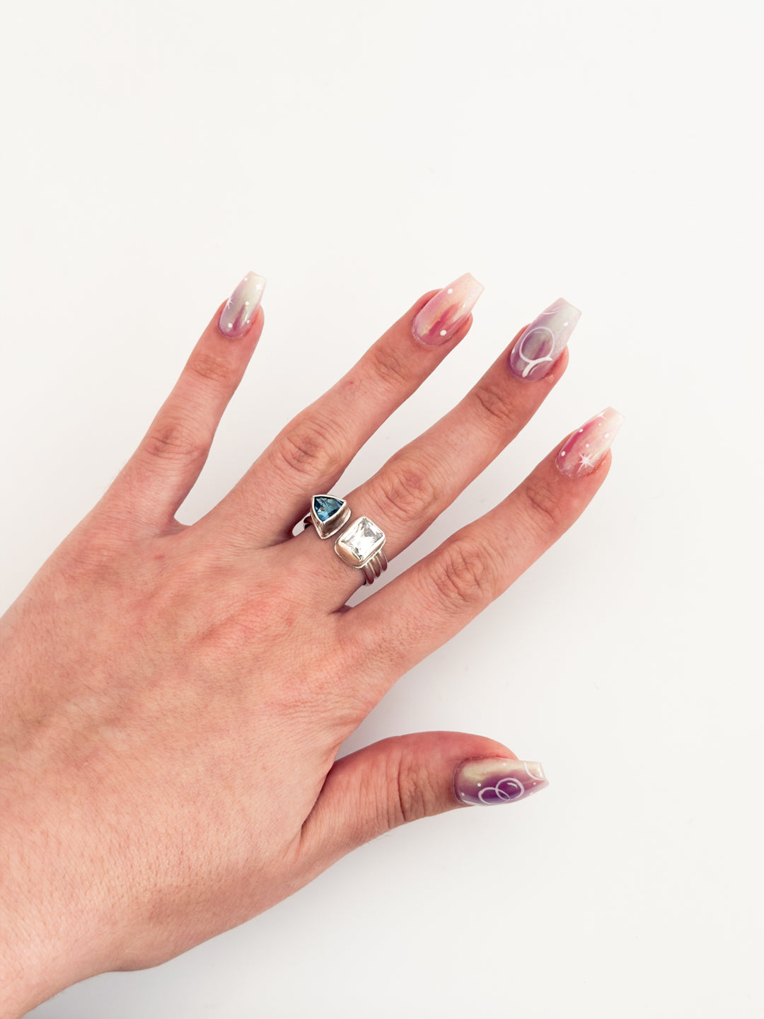 Adujstable ring with London Blue Topaz & emerald cut Cubic Zarconian gemstones with a Trillium base by Cathy Miller. The geometric design brings modern elegance, while the shimmering gemstones catch the light from every angle.