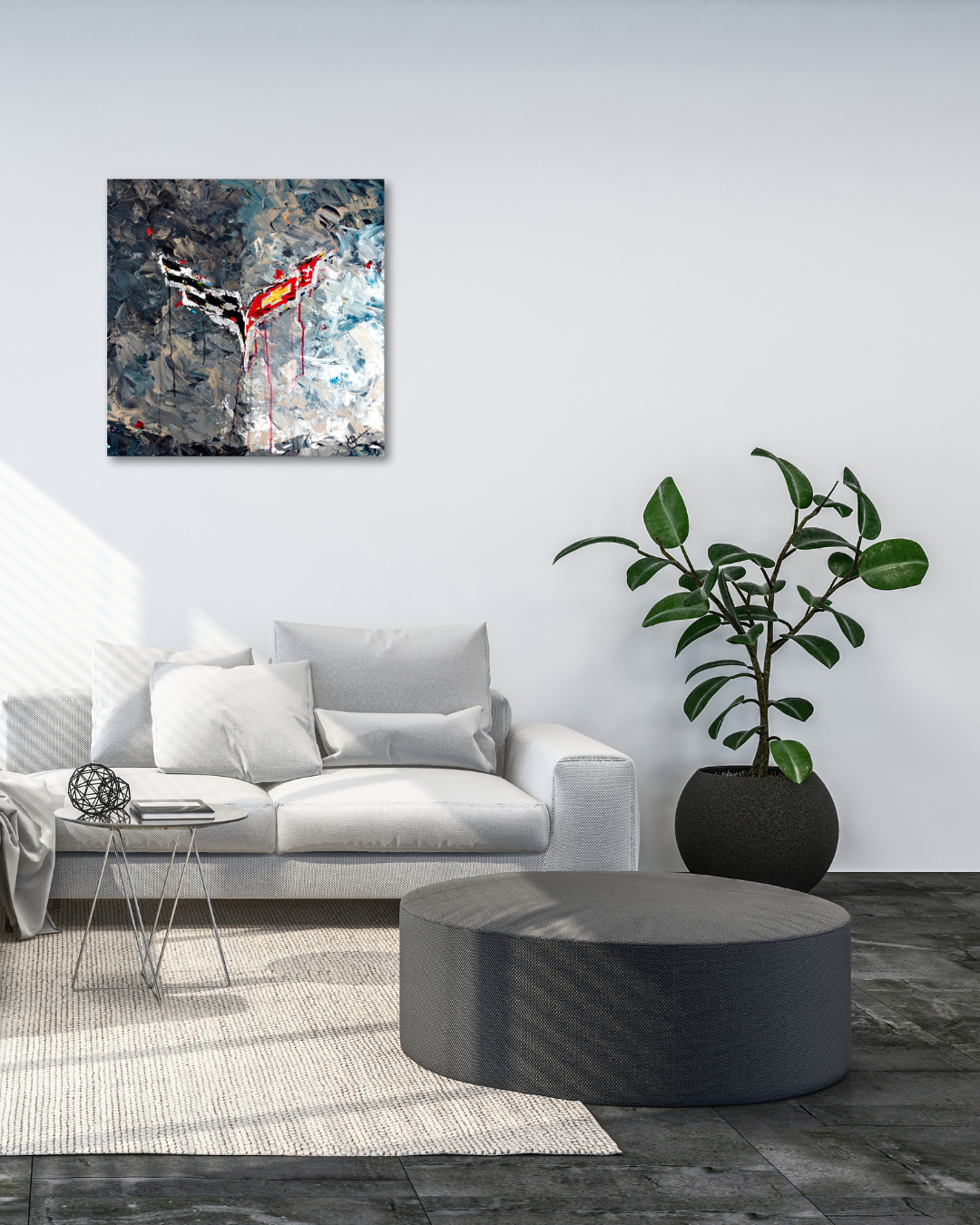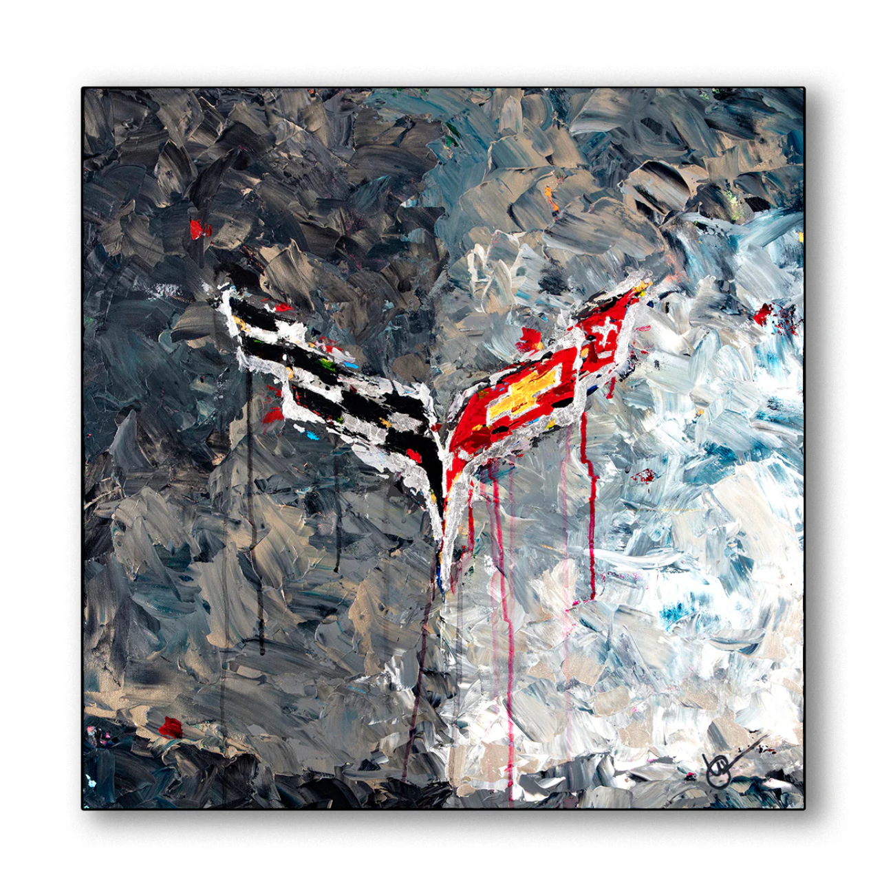 Carla is a giclée on canvas (e.d. 15/100) at size 24" x 24" by notable palette artist, Lyn Hiner. It features an abstracted version of the Corvette Emblem.