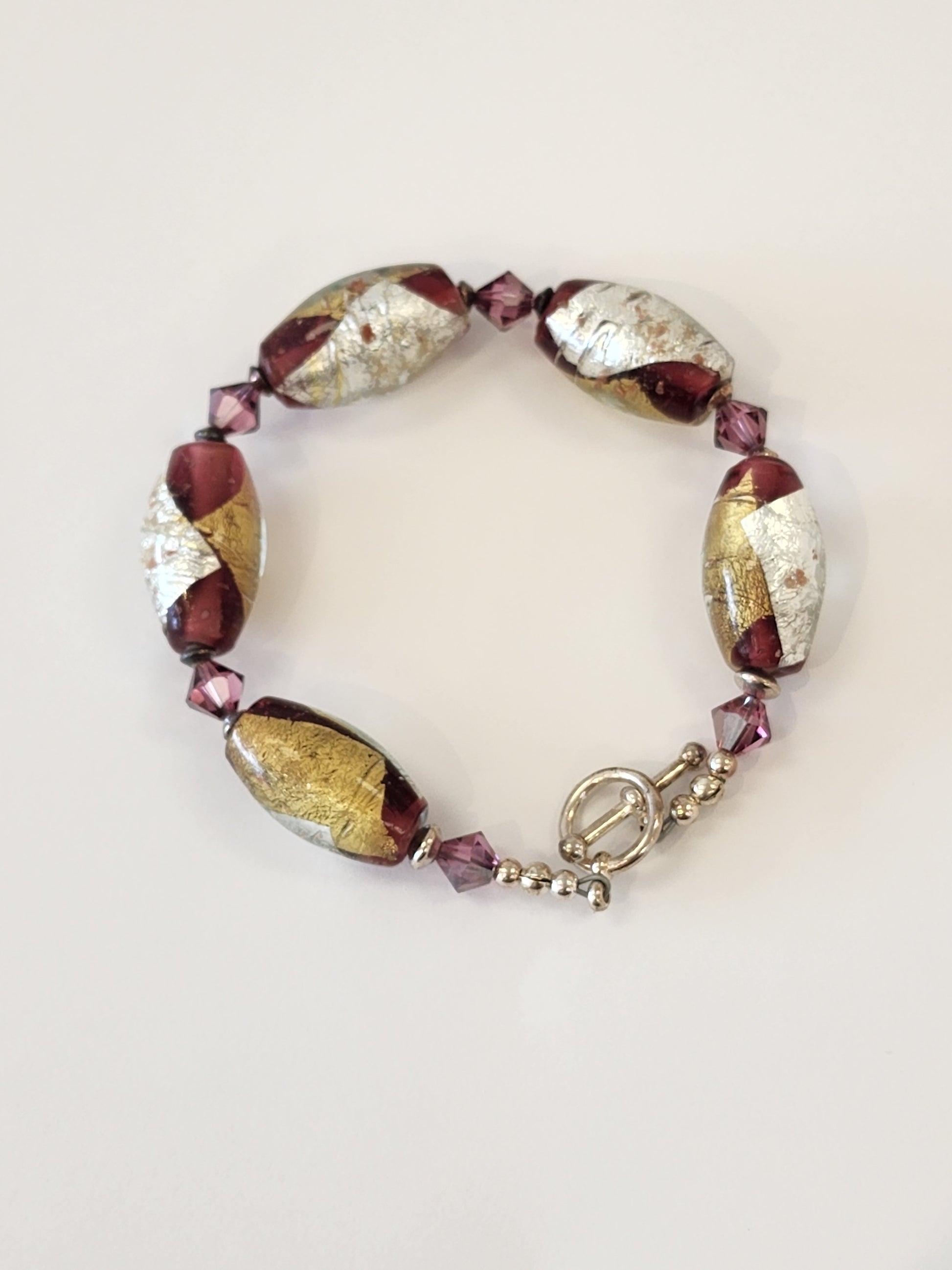 Semi transparent burgundy-hued glass beads, with silver and gold foil accents inside of glass beads by local jeweler Nancy Neeb. These High quality beads are spaced between alternating silver round bead spacers and burgundy Swarovski crystals. Set with a sterling silver clasp, approximately 9". Resizing is available.