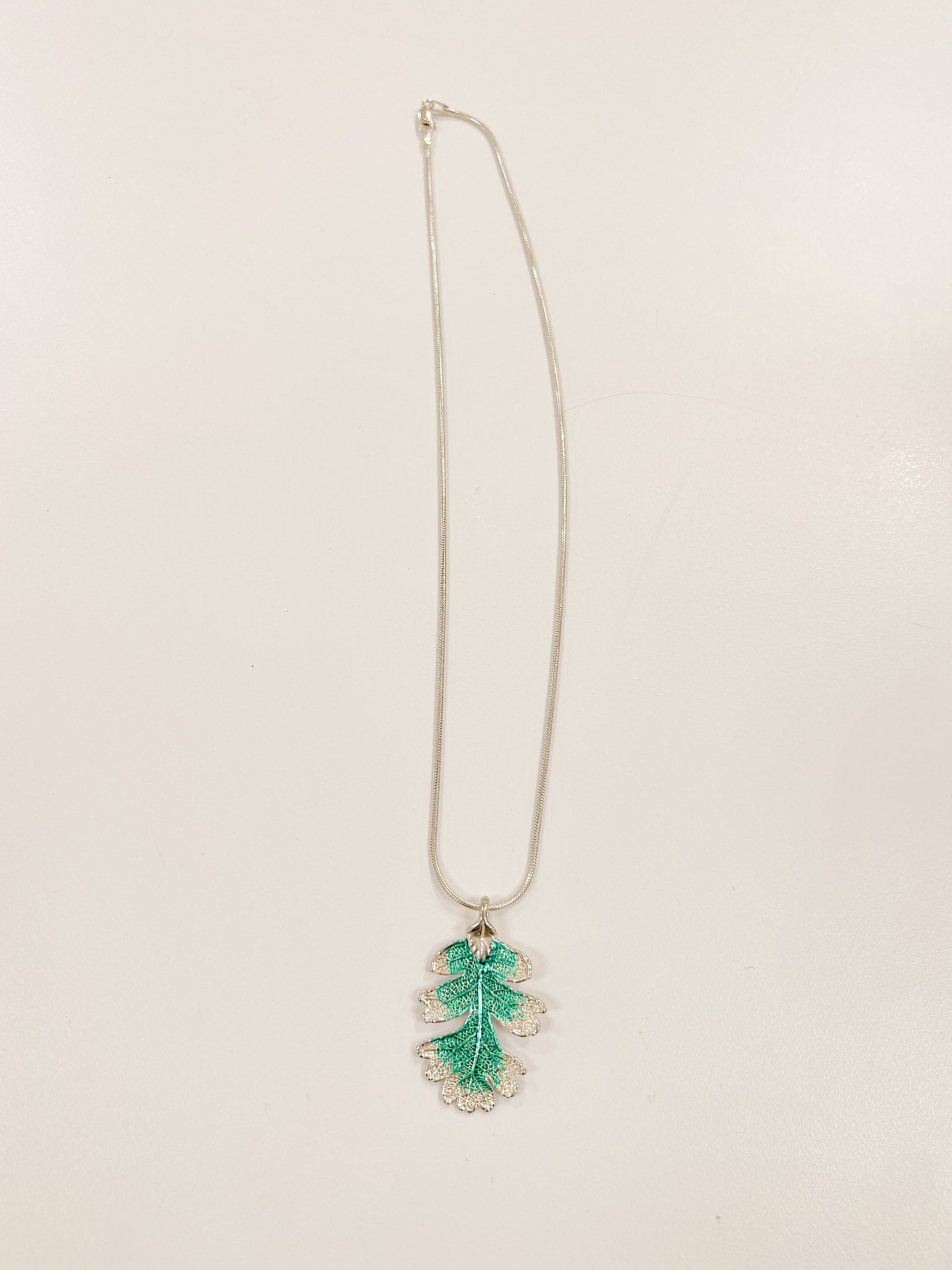 Jeweler Nancy Neeb's Green Leaf Pendant Necklace features a fine silver, hand shaped leaf. Nancy added a small amount of green porcelain paint to add a pop of color to this lightweight pendant. Complete with a sterling silver chain. Made to be worn long but length can be adjusted upon request.