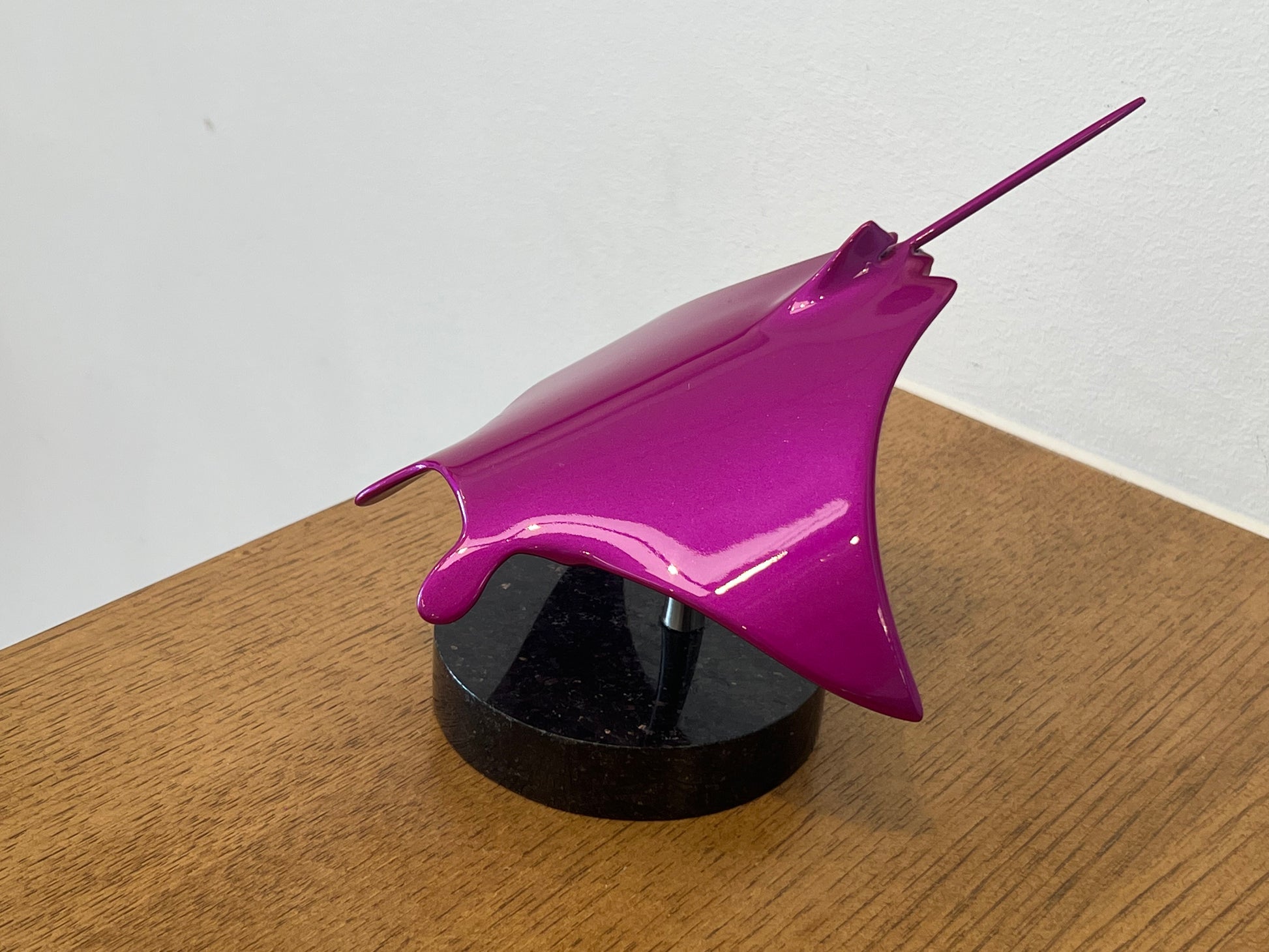 Original Sculpture by Dillon Powell of a Manta Ray, measuring 8" x 6" x 10." With over 10 years of experience in all facets of metal fabrication and fine art, Powell creates one of a kind sculptures with the skill of a tradesman and the eye of an artist. He uses traditional fabrication techniques and a combination of metal patinas, automotive paints, and protective coatings to achieve his signature, radiant color scheme and finishing techniques.