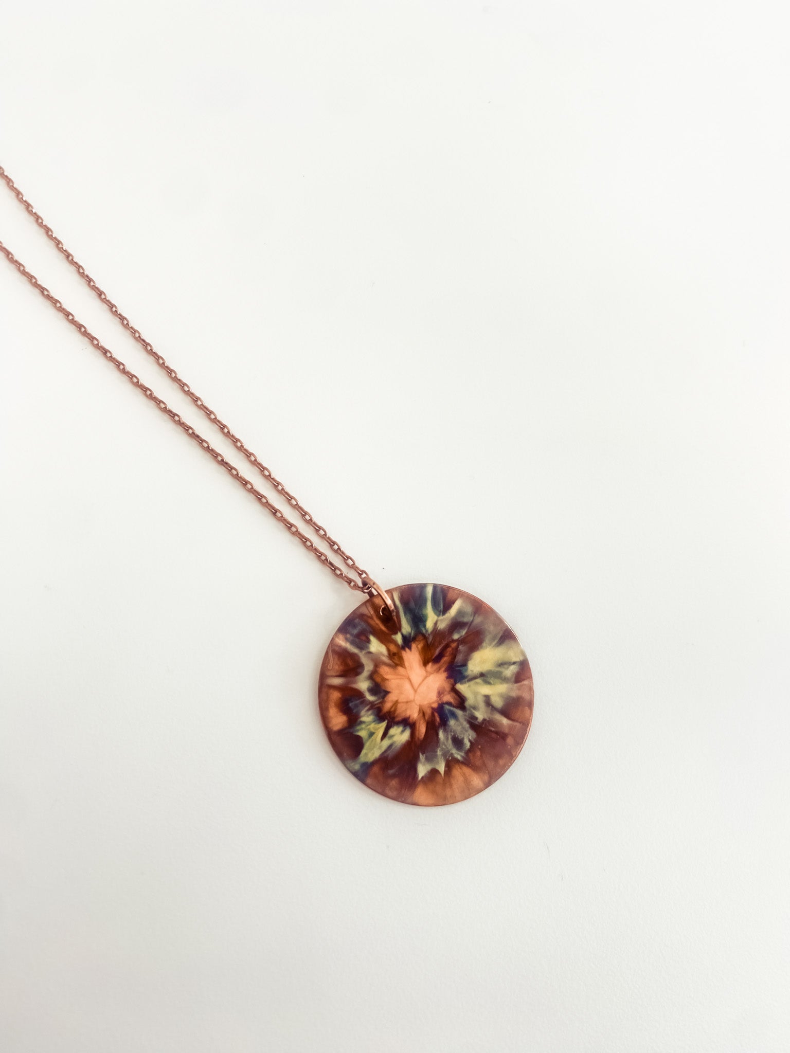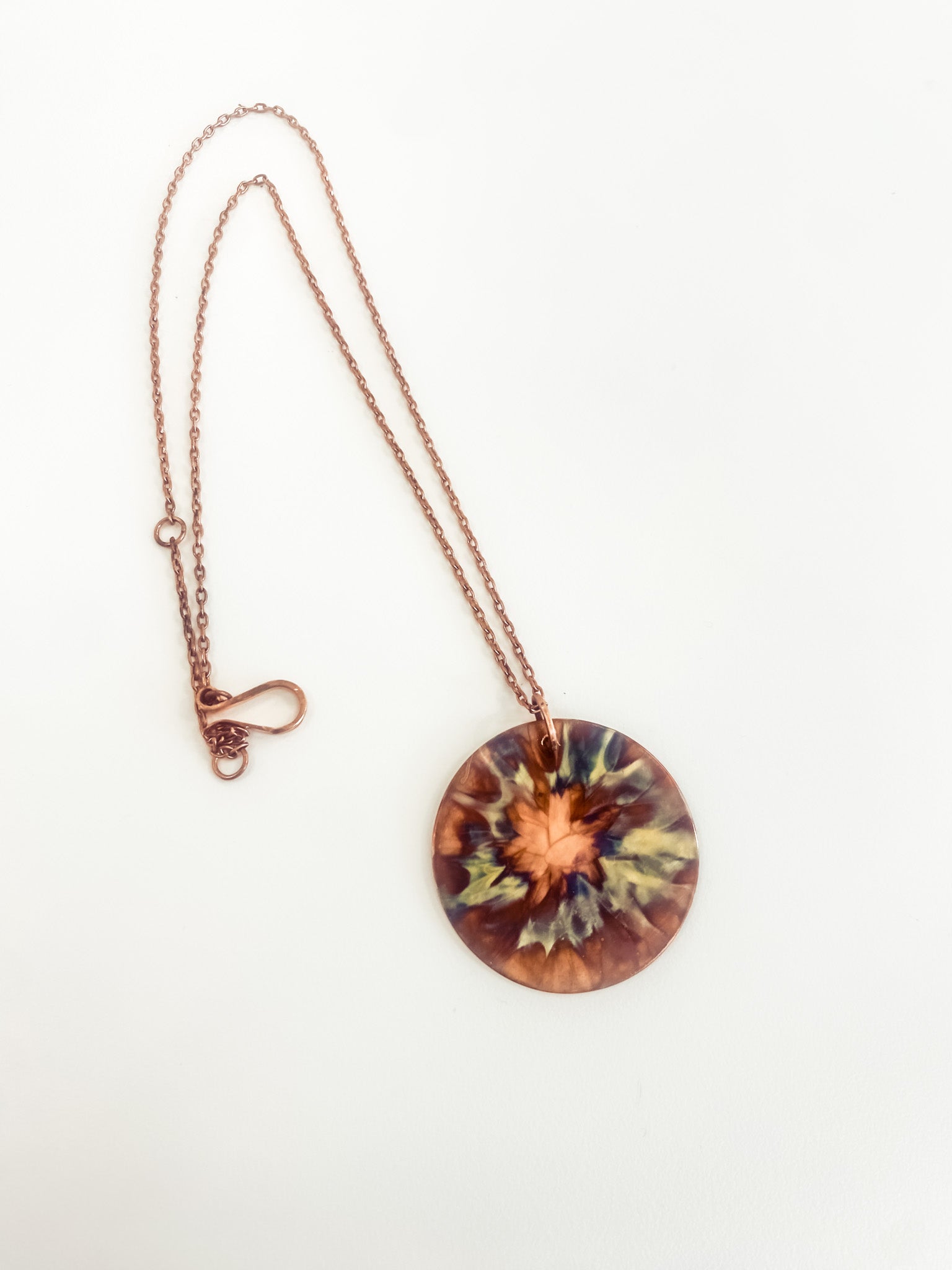 One of a kind copper necklace by Jen Kish of Imaginarium Jewelry. She uses fire to hand paint the pendant, creating a unique design. The copper is lacquered to give it a distinct finish.
