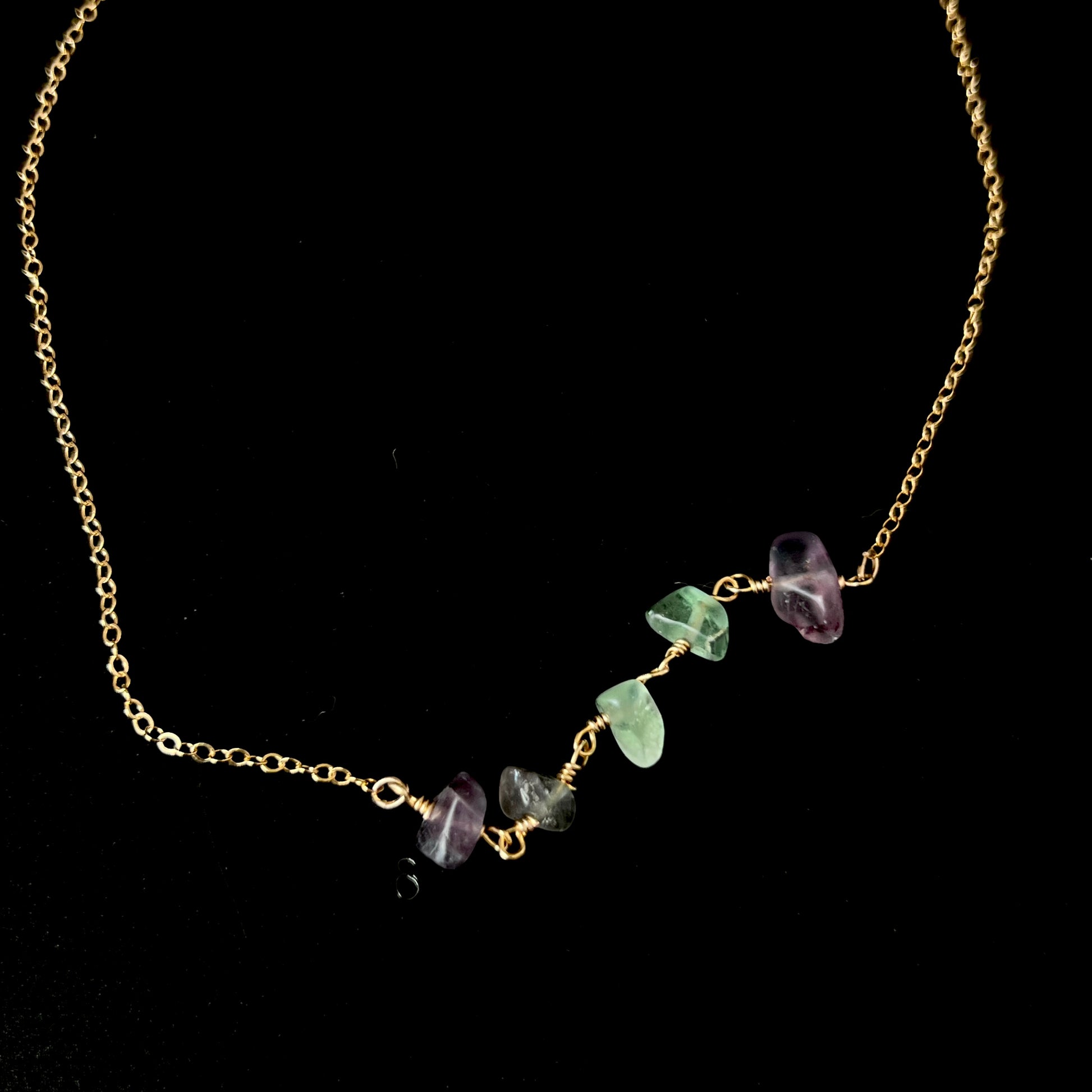 Beautiful gold necklace by Lisa Brito with 5 fluorite green and purple crystals threaded through. It is very light and comfortable, a wonderful day to day piece!