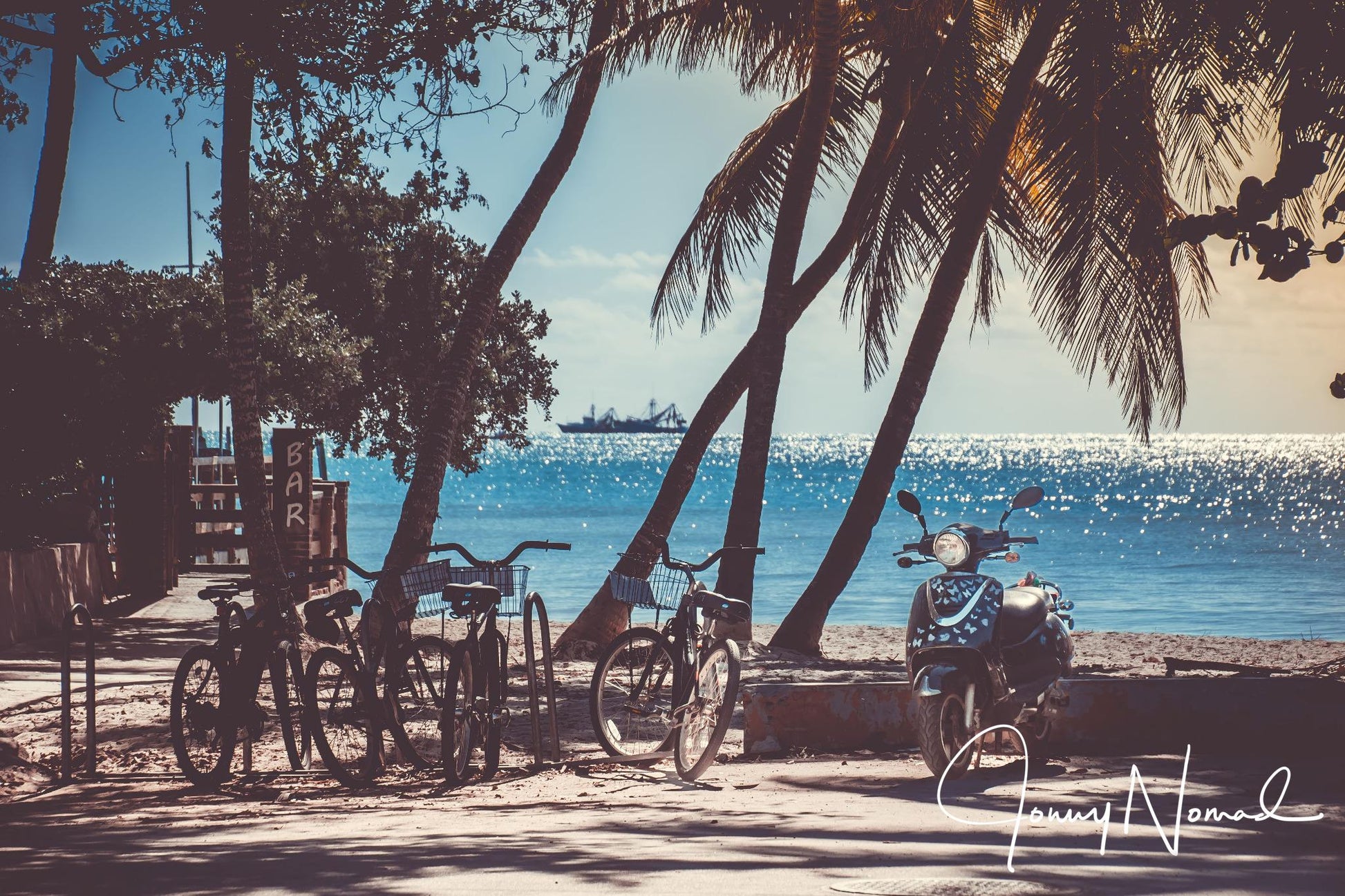 17" x 11" photograph on canvas by Jonny Nomad featuring bicycles and a moped.