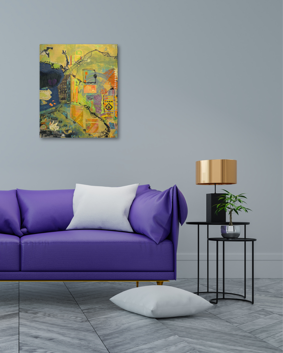 20" x 24" original Mixed Media on canvas by Ricki Stofsky. The artist is a member of the Florida Women's Arts Association (FLWAA). This work is part of Gallery500's exhibition "50 Shades of Payne's Grey." In this exhibition, FLWAA members interpret the versatile color of Payne's Grey through their own individual lens and media.