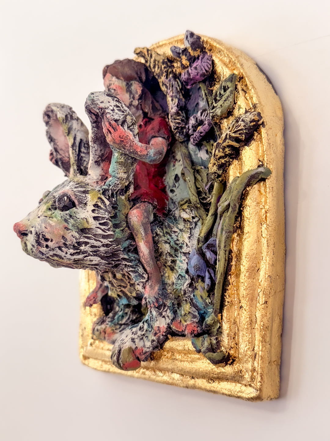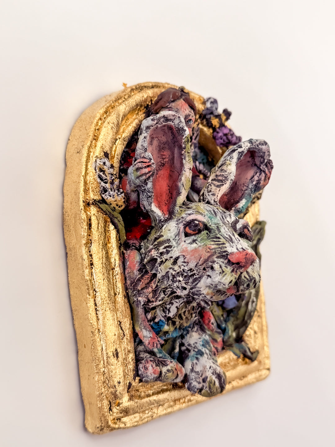 4.5" x 6.5" hand sculpted clay sculpture by Julie Latayan. In this piece, Latayan creates a clay frame that is hand painted with gold leaf. The girl and bunny sculpted image inside the frame is 3-dimensional, literally coming out of the clay frame. Merging her painting skills with ceramic sculpture, creating fresh new forms. In this way, Julie finds she express herself in both color and shape. She sculpts and fires the clay, cold finishing her pieces in acrylic paint.