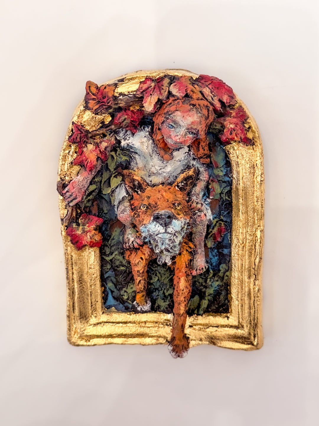 4.5" x 6.5" hand sculpted clay sculpture by Julie Latayan. In this piece, Latayan creates a clay frame that is hand painted with gold leaf. The girl and fox sculpted image inside the frame is 3-dimensional, literally coming out of the clay frame. Merging her painting skills with ceramic sculpture, creating fresh new forms. In this way, Julie finds she express herself in both color and shape. She sculpts and fires the clay, cold finishing her pieces in acrylic paint.