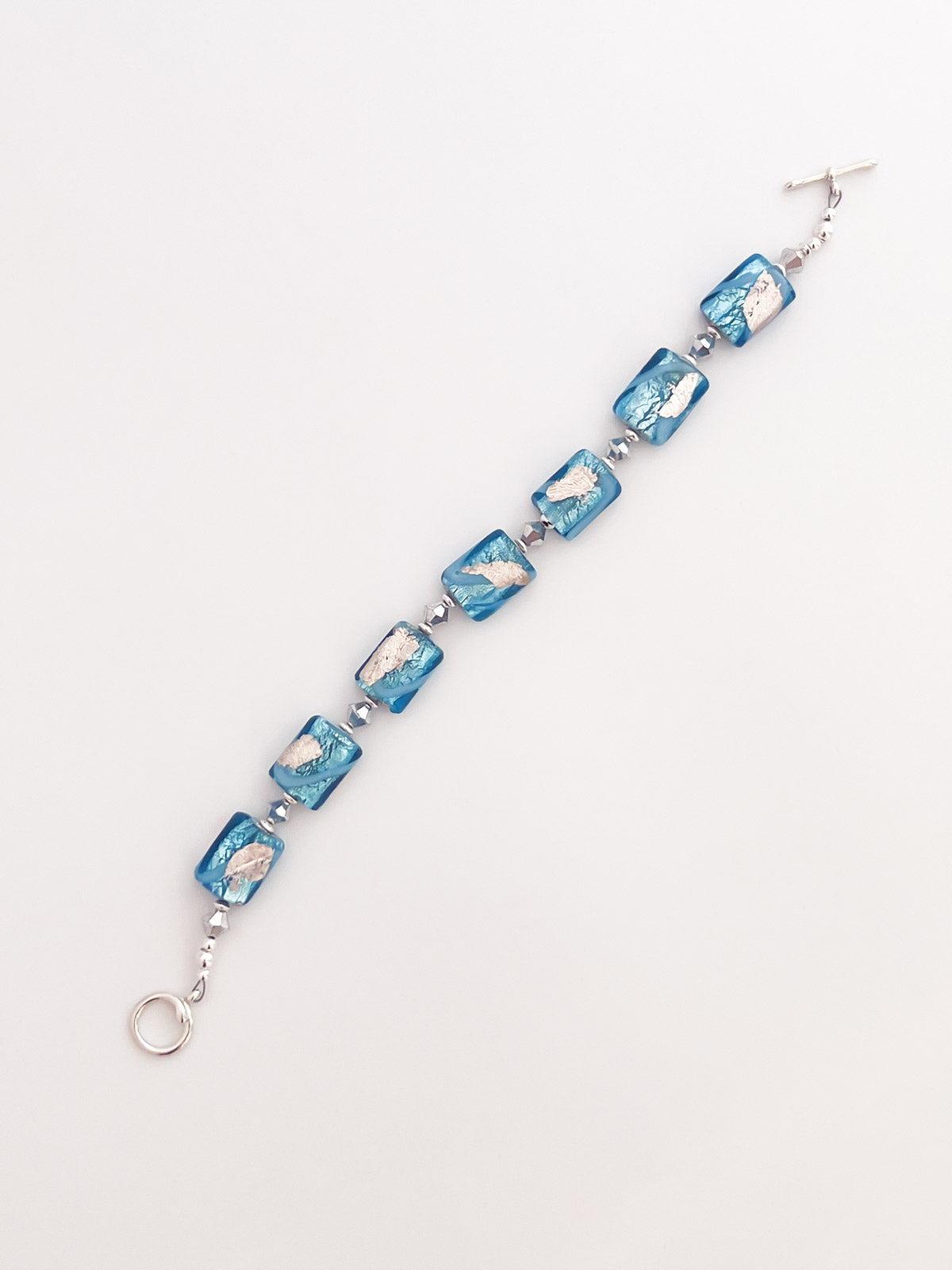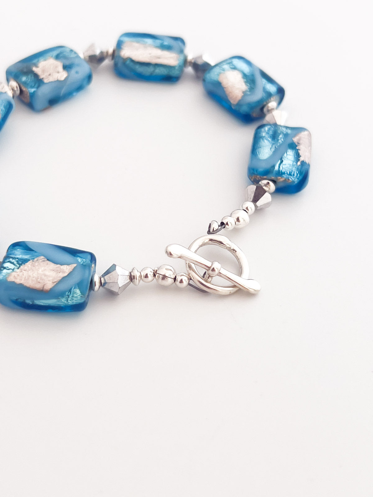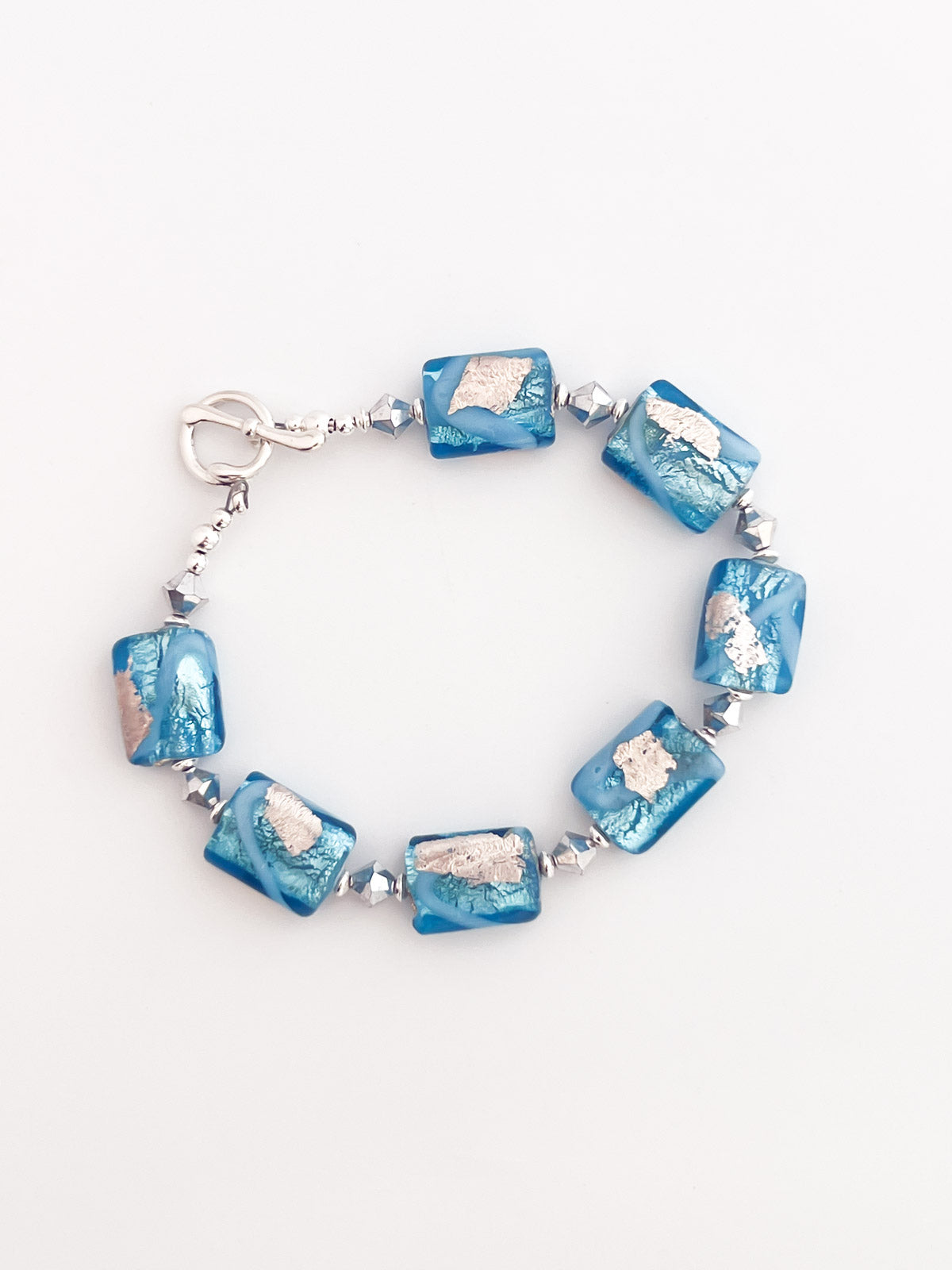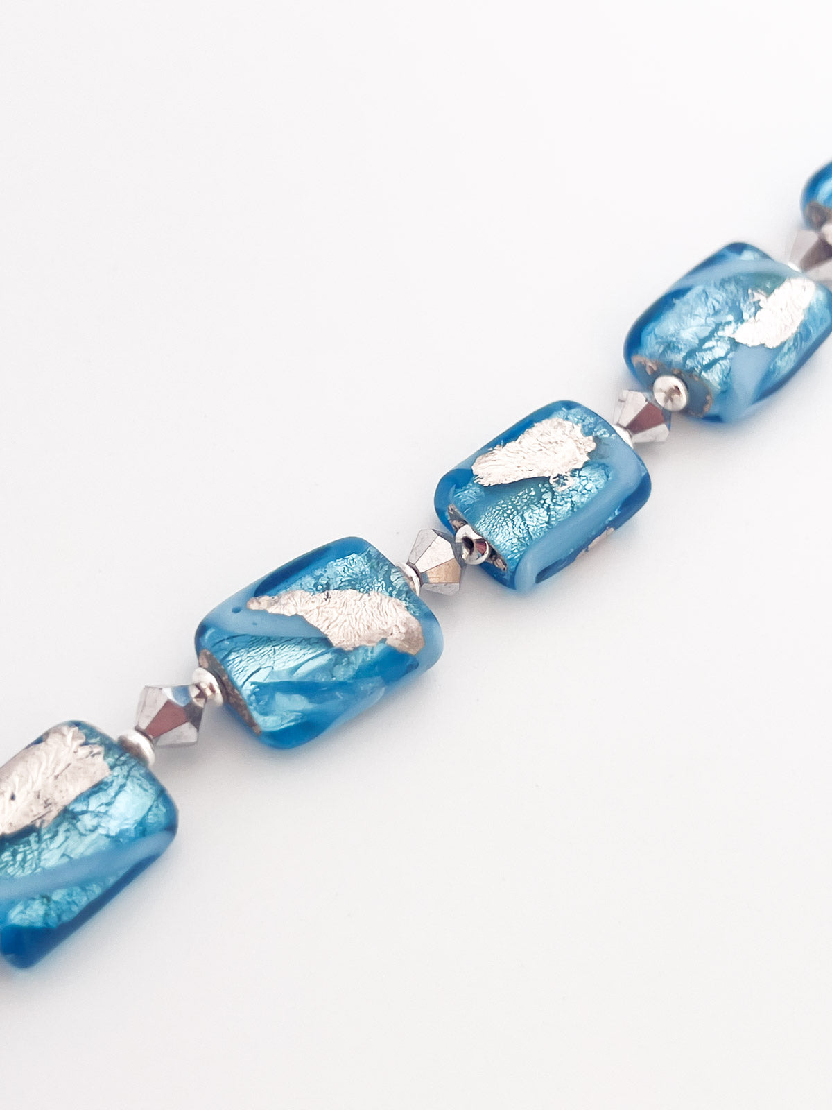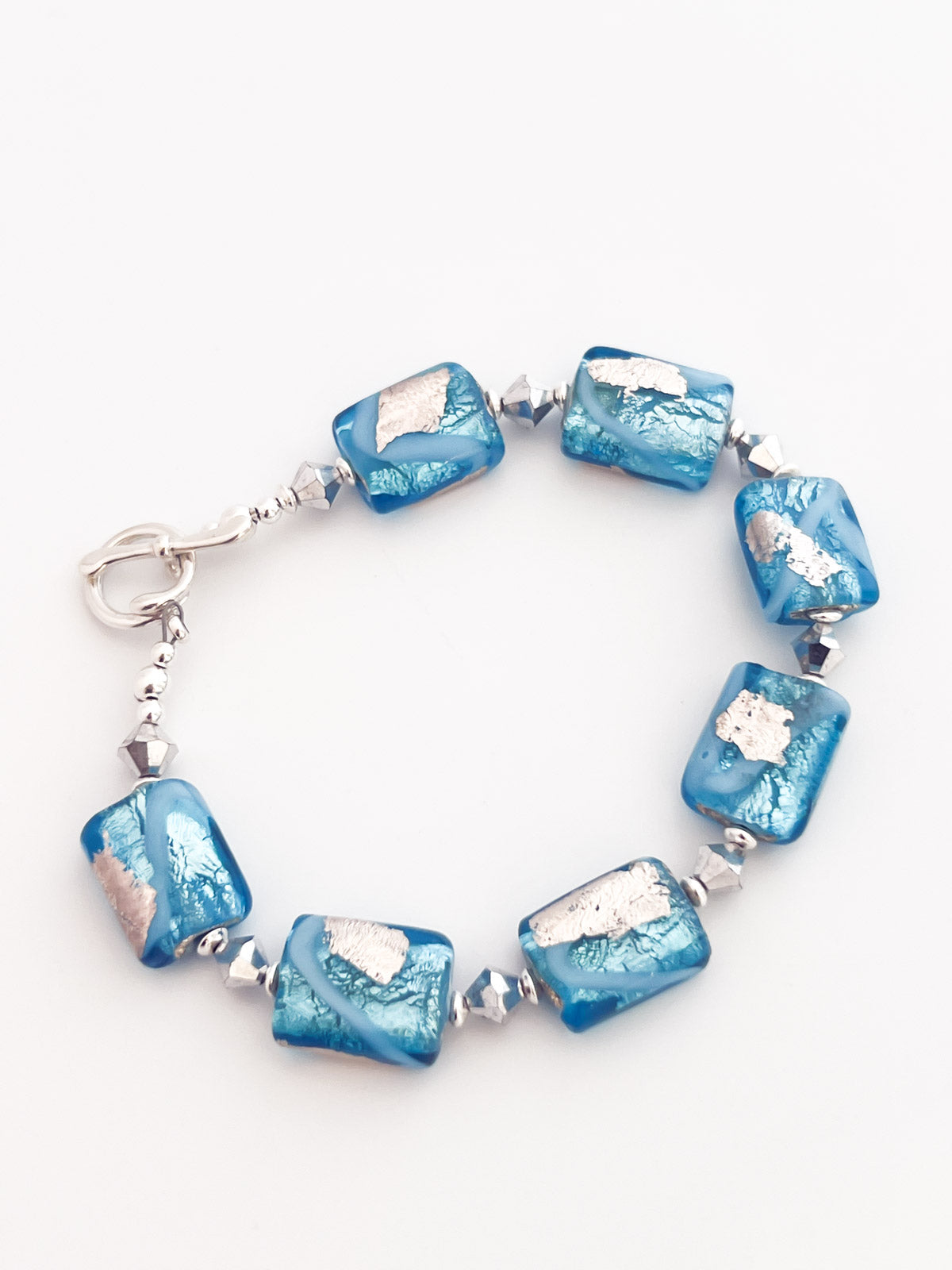 Beautiful glass beads in shades of blue mixed with silver foil. Bacon 6mm silver Swarovski crystal bead accents and sterling silver 3mm round balls fill in along with a silver clasp. Approximately 8" in length
