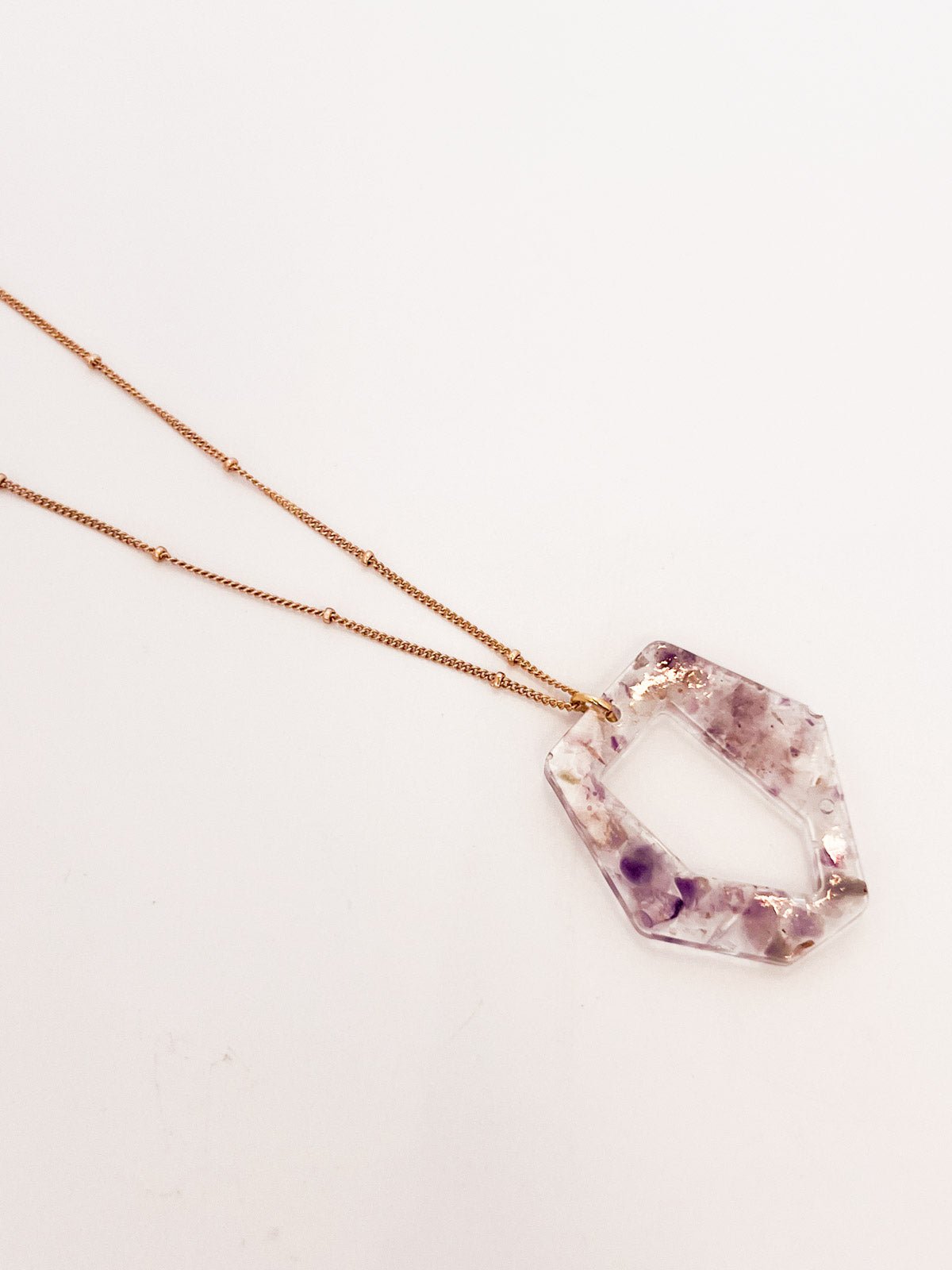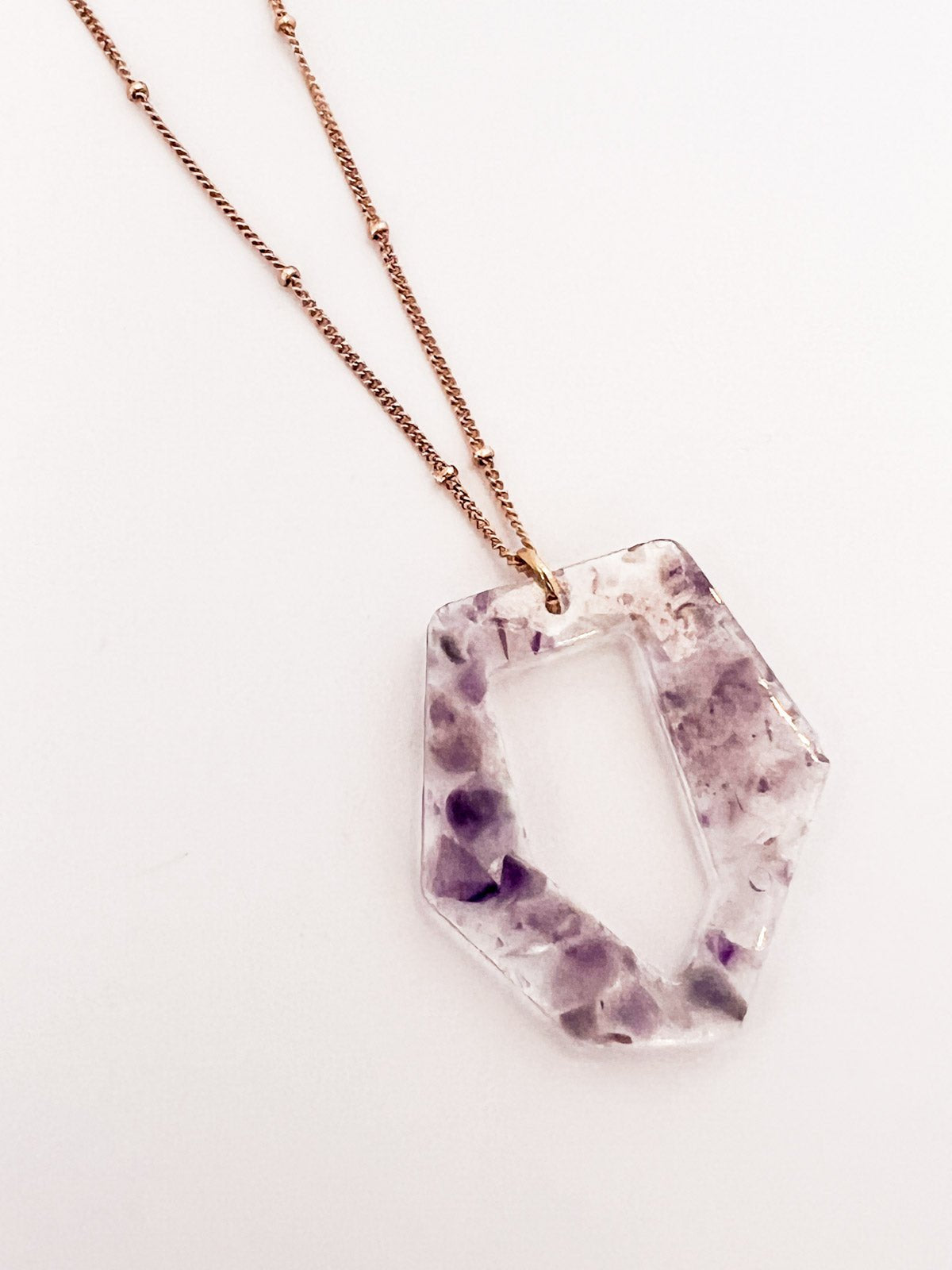 Handmade upcycled resin necklace made with Amethyst and 30" gold chain.