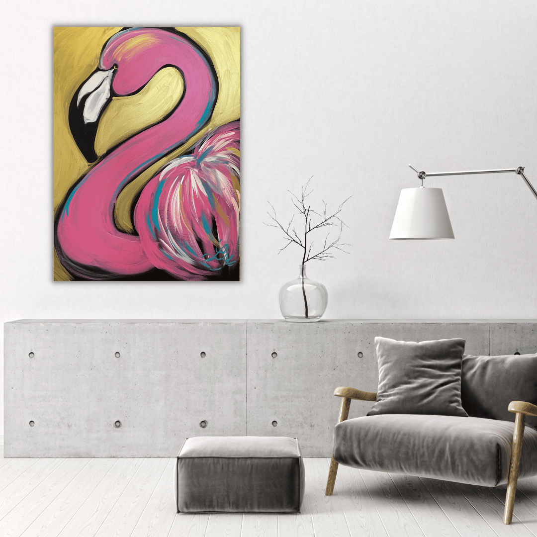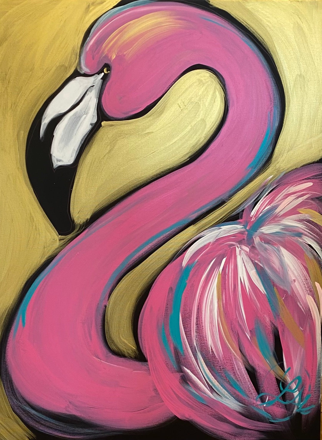 30" x 40" original acrylic on canvas by North Carolina based artist Laura Ashley. Laura Ashley's work is reflective of her personality, colorful and vibrant. She works with loose brush strokes, highlighting the work with a fresh gold background. This piece was painted live during Jeep Beach 2023 events.