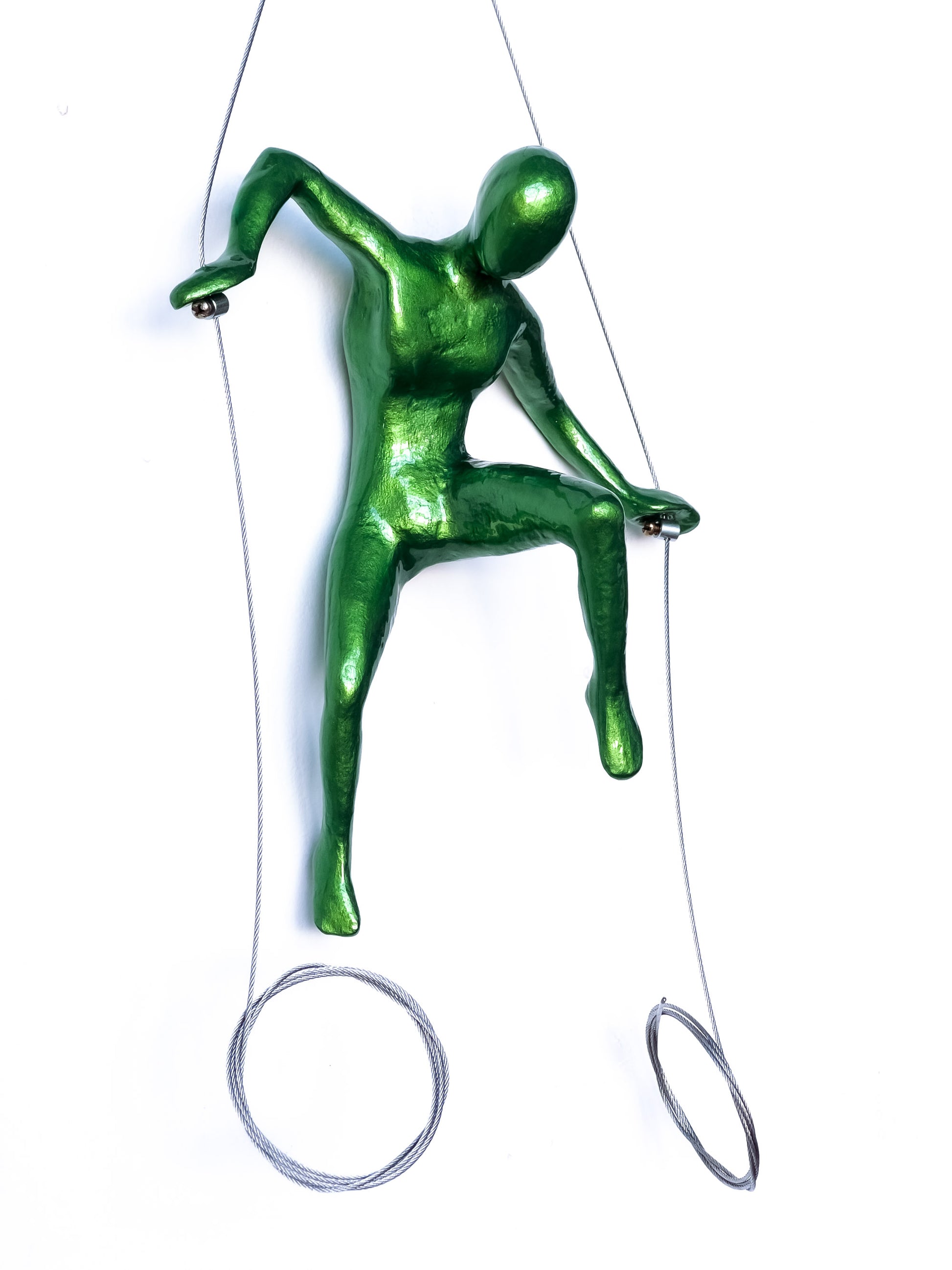 Ancizar Marin, 10 x 4.5 x 6 inch fiberglass, volcano rock and bronze sculptures finished with forest automotive paint. This piece is hand crafted and represents a rock climber or acrobat climbing up or repelling from the surface of the wall.