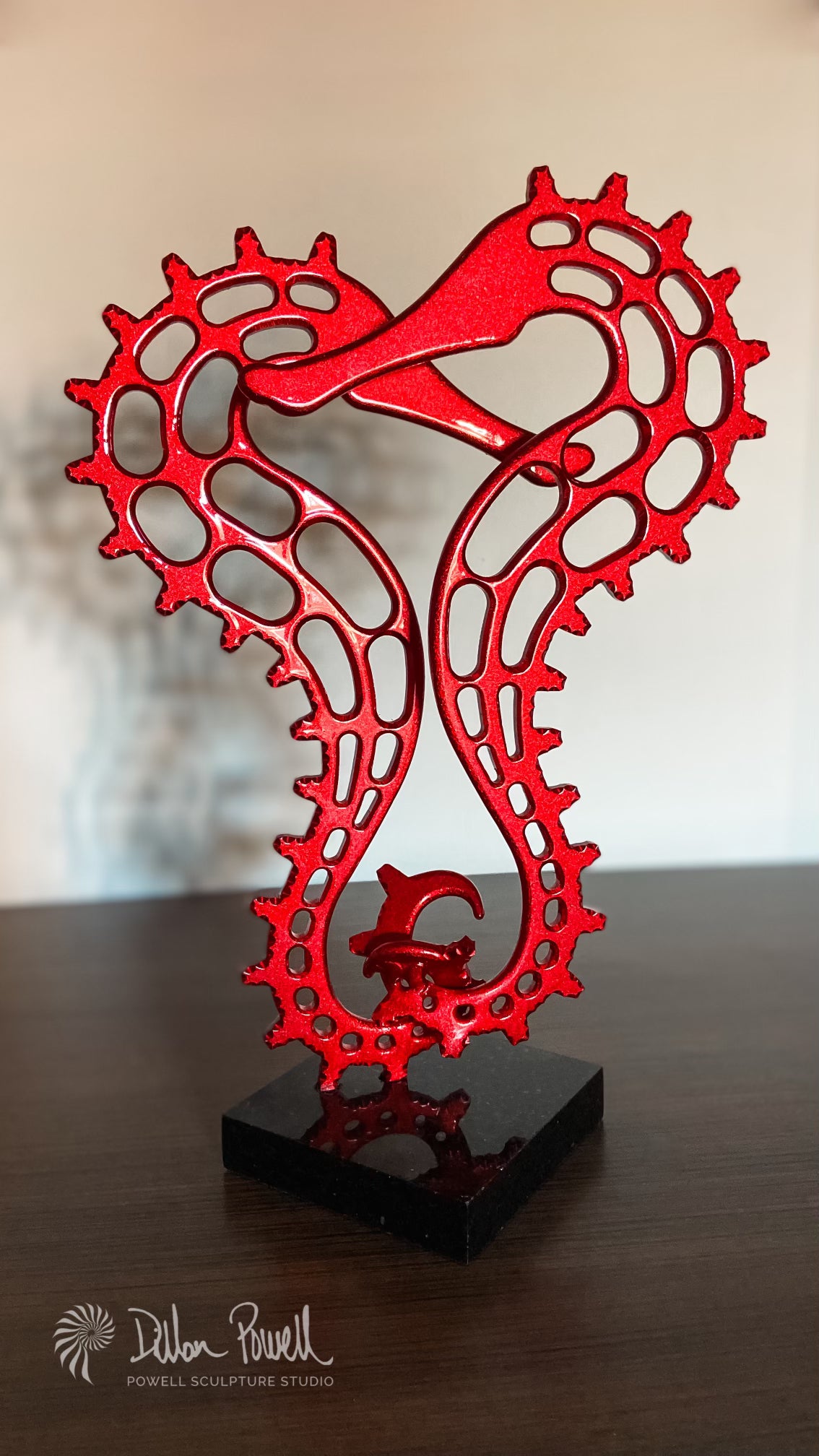 12 x 10 x 4 inch original aluminum sculpture by aquatic artist Dillon Powell. Dillon is a multidisciplinary artist known for his dynamic aquatic sculptures, and his incredible architectural installations. As a Florida native, Dillon has always been inspired by the natural beauty of the area. This piece is finished in Kandy Apple Red and sealed with a clear coat., with a 4" black granite base.