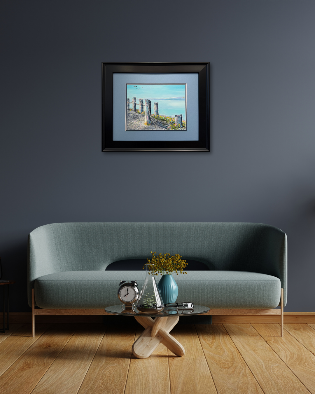 This piece is framed in a modern black frame with double custom matte and ready to hang.
