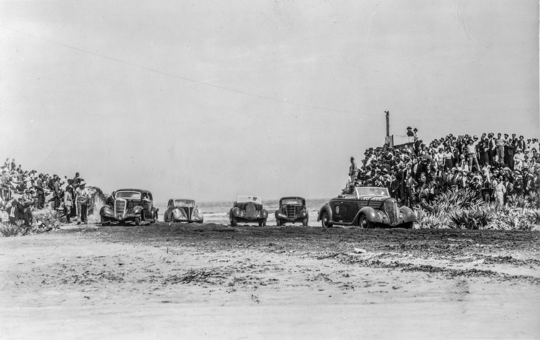 This image depicts the early beach races in the sand, with crowds forming along the bluffs to watch.