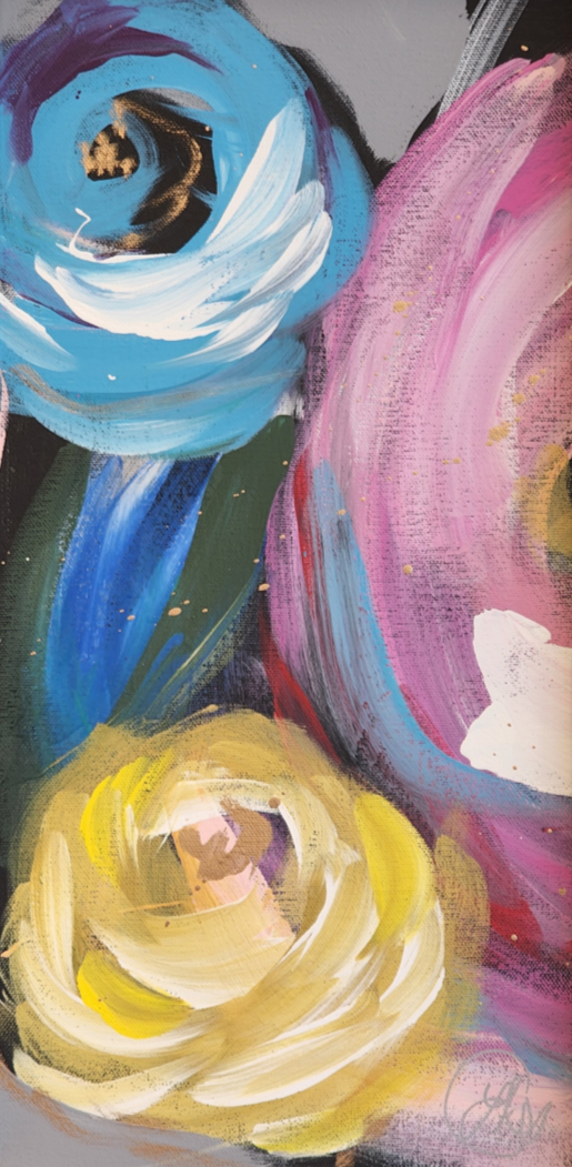 10" x 20" Original acrylic on canvas by North Carolina Artist Laura Ashley. Created in her bold style, Laura uses loose brushstrokes and bold colors to create this floral landscape. This piece is framed in a handmade wood frame.