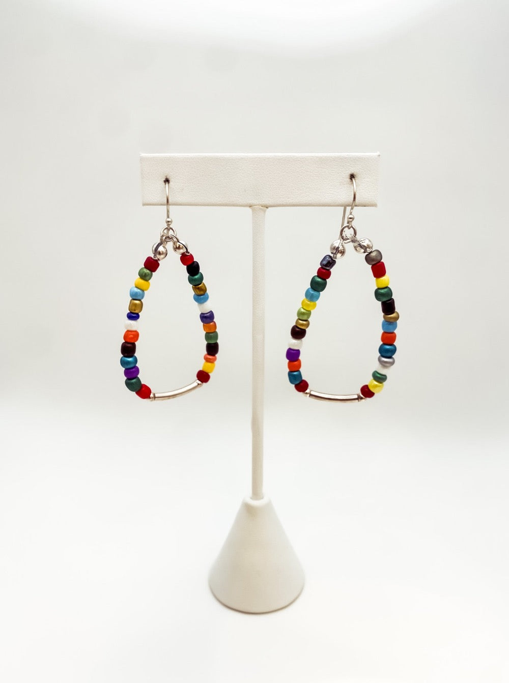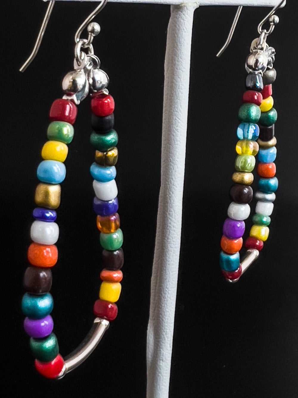 Handmade by local jeweler Nancy Neeb, These earrings feature a colorful mixture of wooden beads strung on a sterling silver chain. At the base of each earring is a sterling curved tube and accent sterling beads. Earrings are set on sterling silver ear wires.