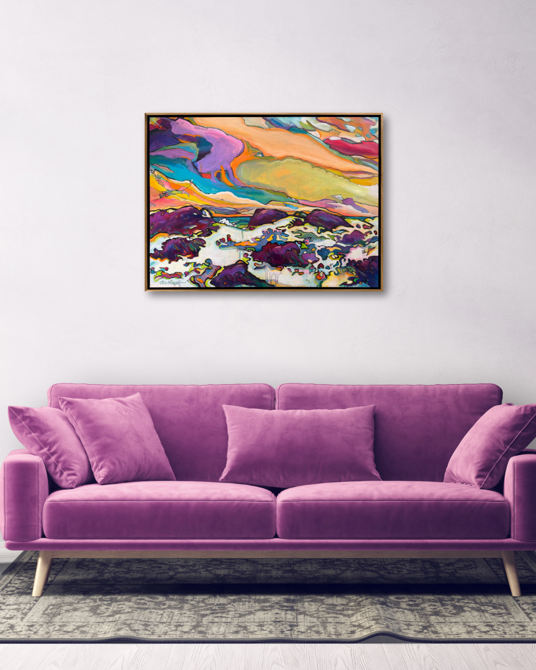 Framed in a natural wood float frame and ready to hang
