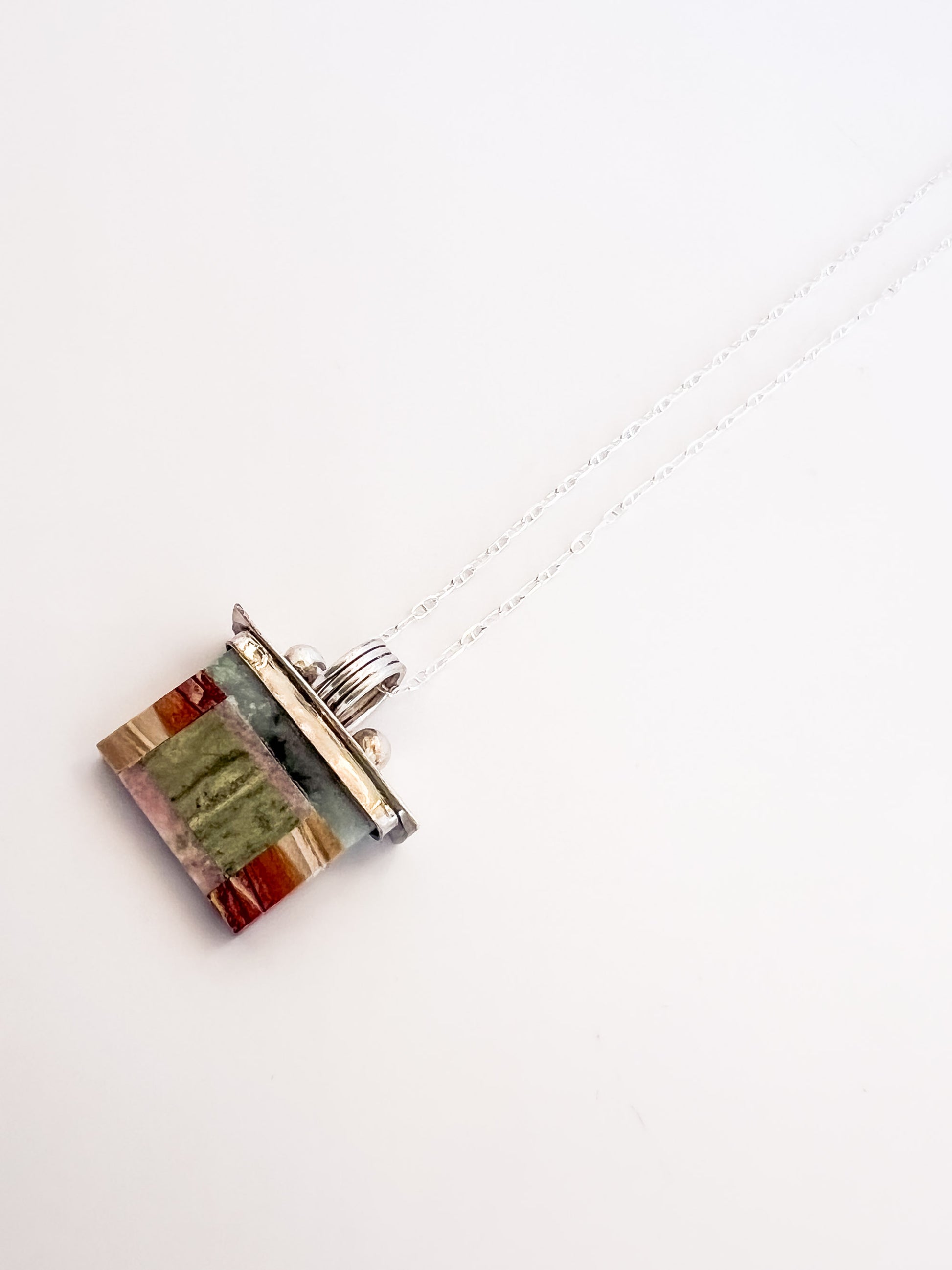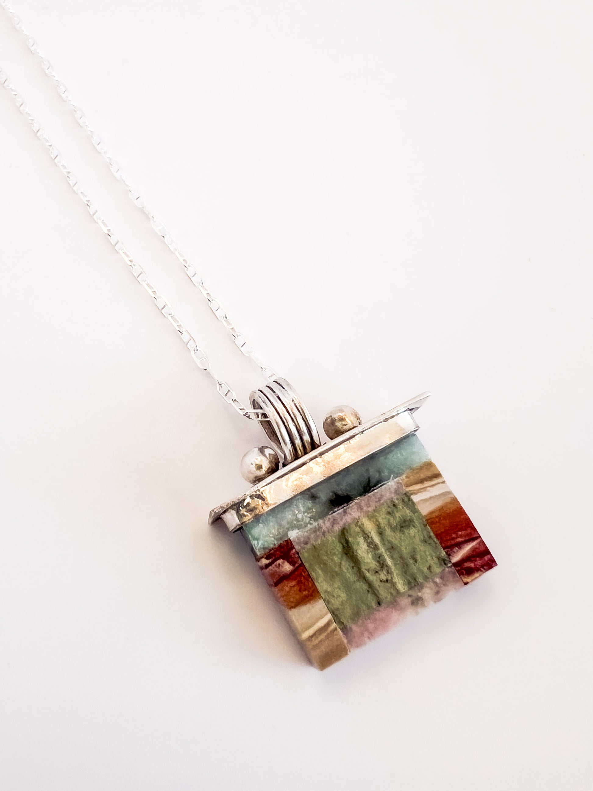 Sterling Silver and Intarsia Cabochon necklace by Mary Wentzel. Made from Jasper and Pink & Green Jade, the artist creates a unique patchwork design.
