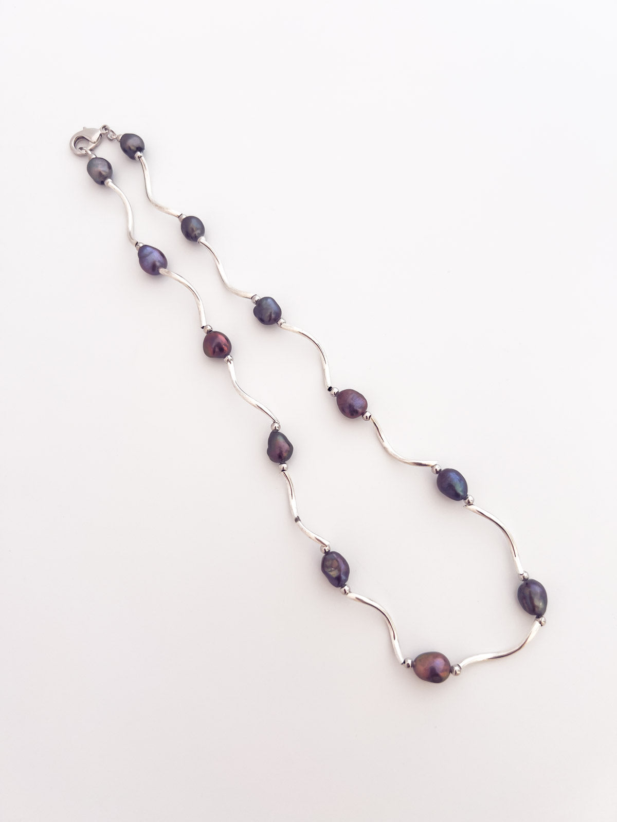 Necklace of mixed fresh water pearls in blue/green, mauve and grey shades. Connected by curved sterling silver tubes and 3mm sterling balls. Sterling silver lobster claw clasp. Approximately 18" in length.