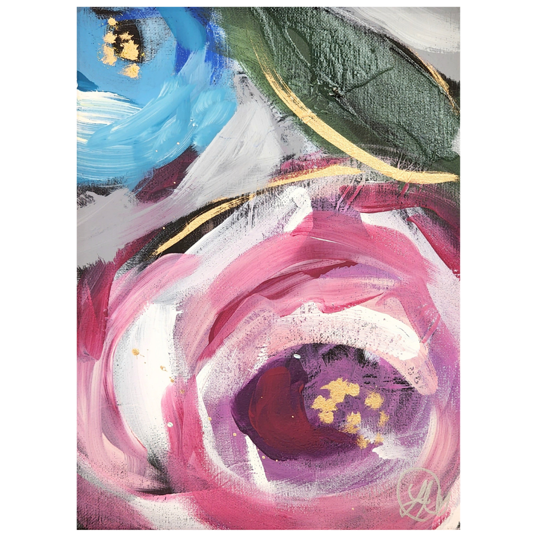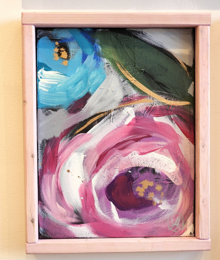 "12x9" Original acrylic painting on canvas by artist Laura Ashley. Inspired by spring, nature, and color, she captures part of a floral scene. Laura added extra detail with a handmade pastel pink washed frame.