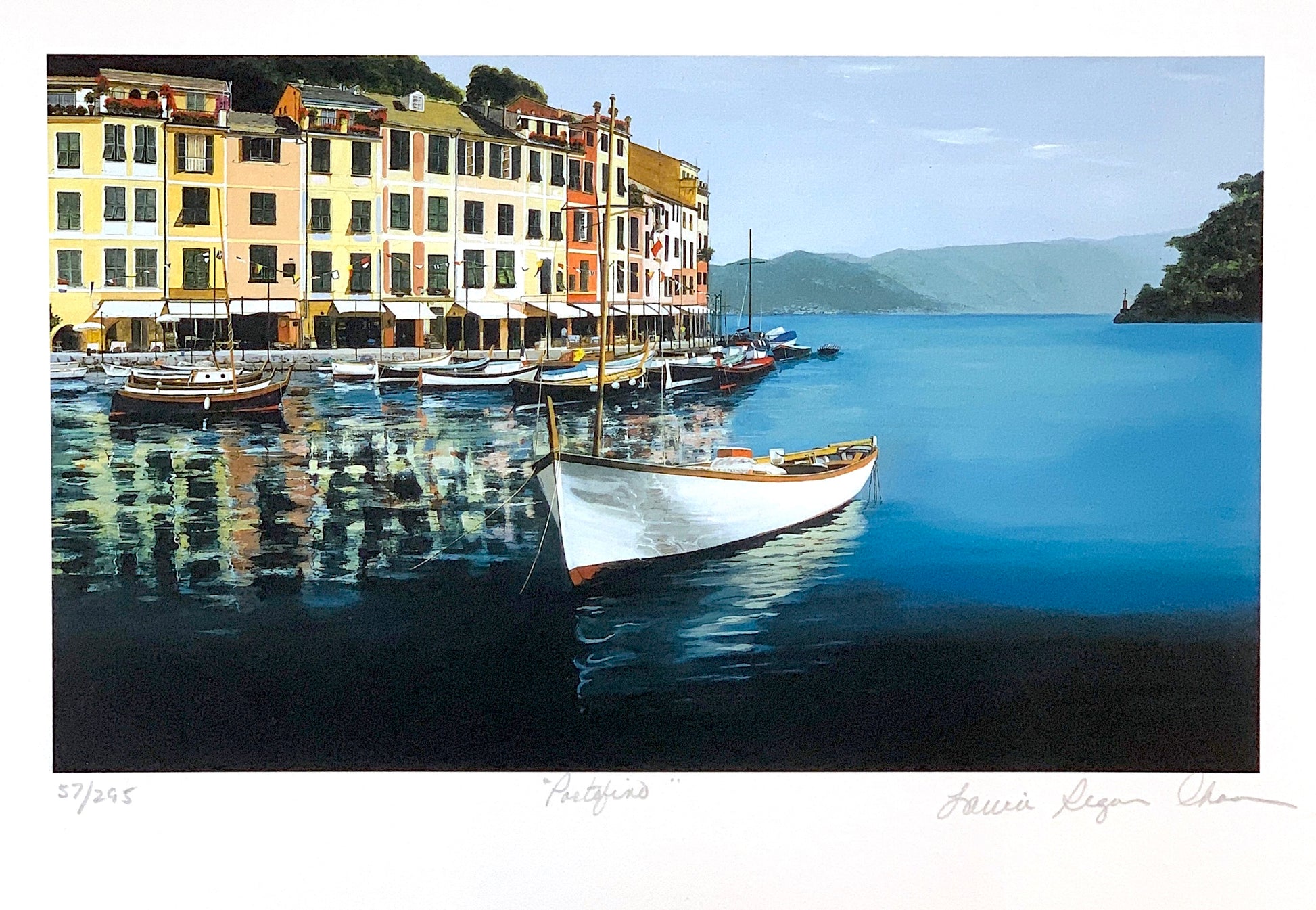 Signed, numbered, and unframed giclée on paper. "Portofino" is an Artist Proof numbered 57 out of 295 depicting a boat dock in the aforementioned fishing village along the Italian Riviera coastline.