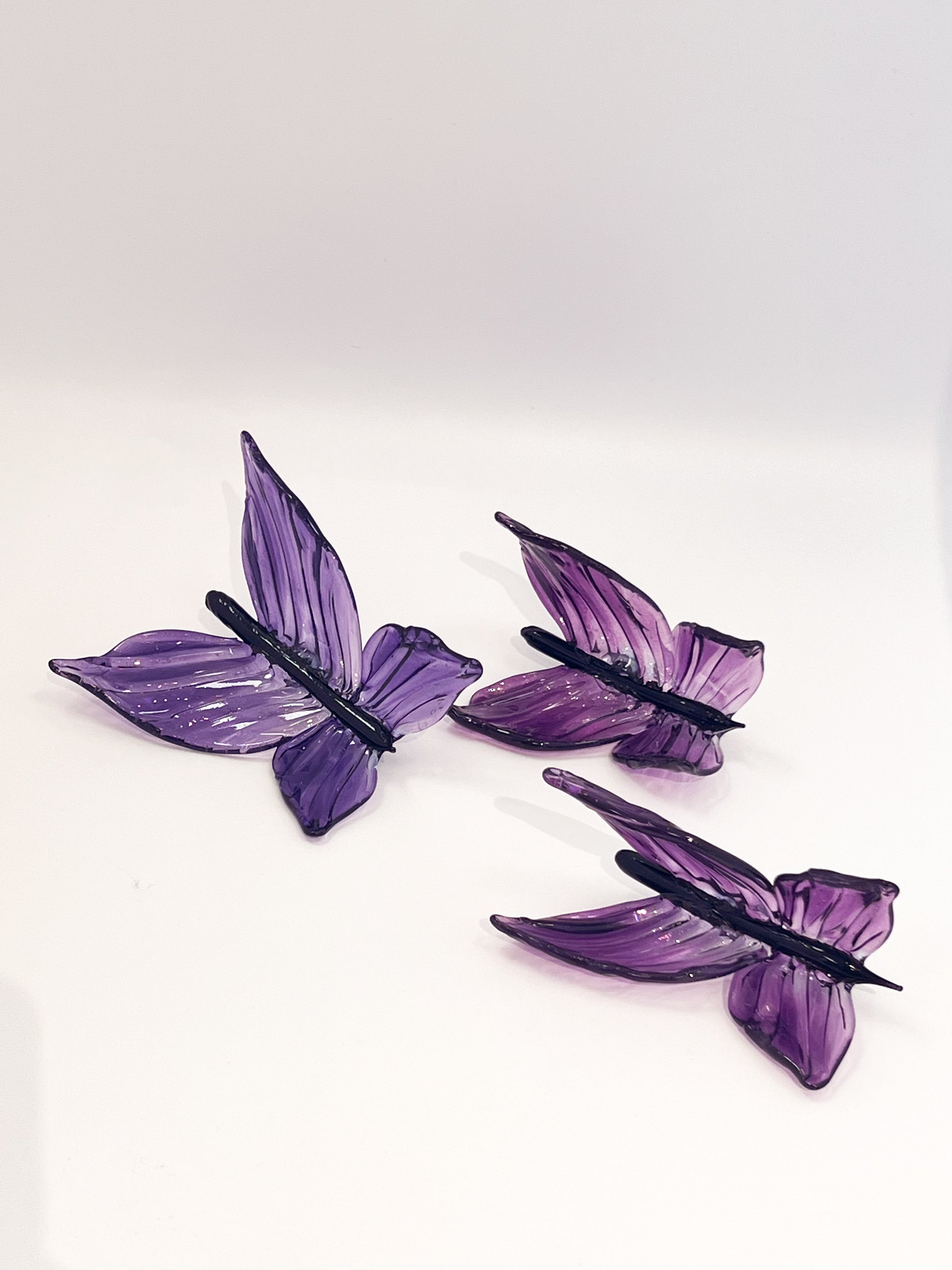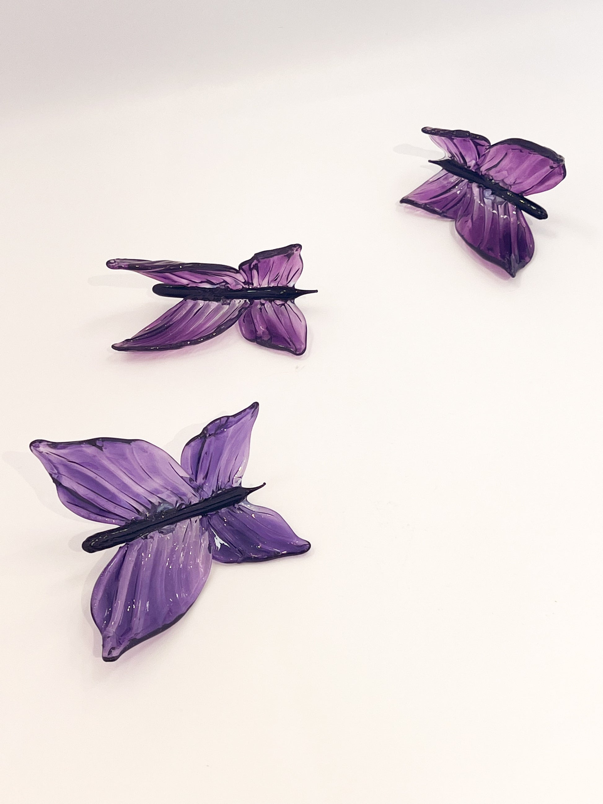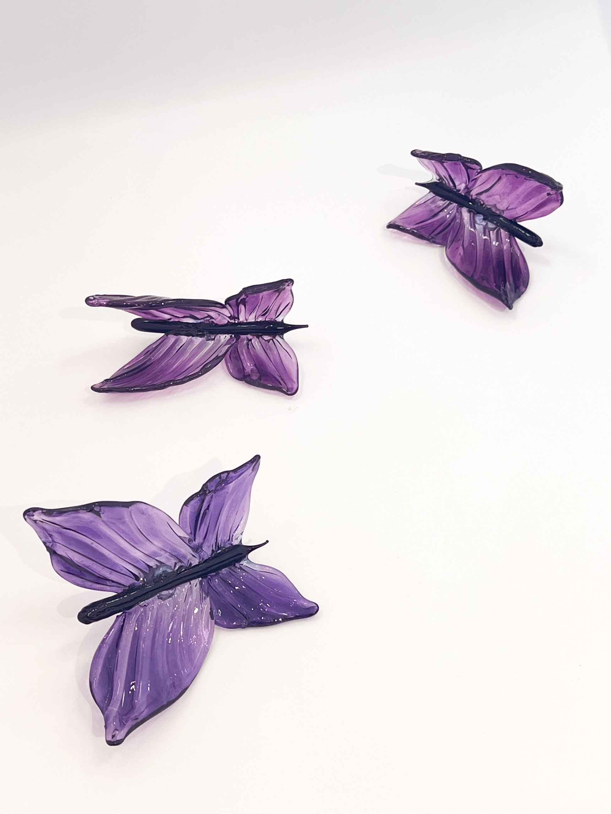 Purple glass-blown butterfly that mounts to wall by artist Tim McFadden.