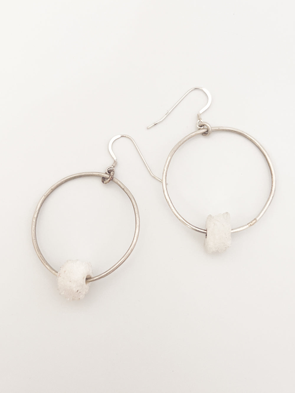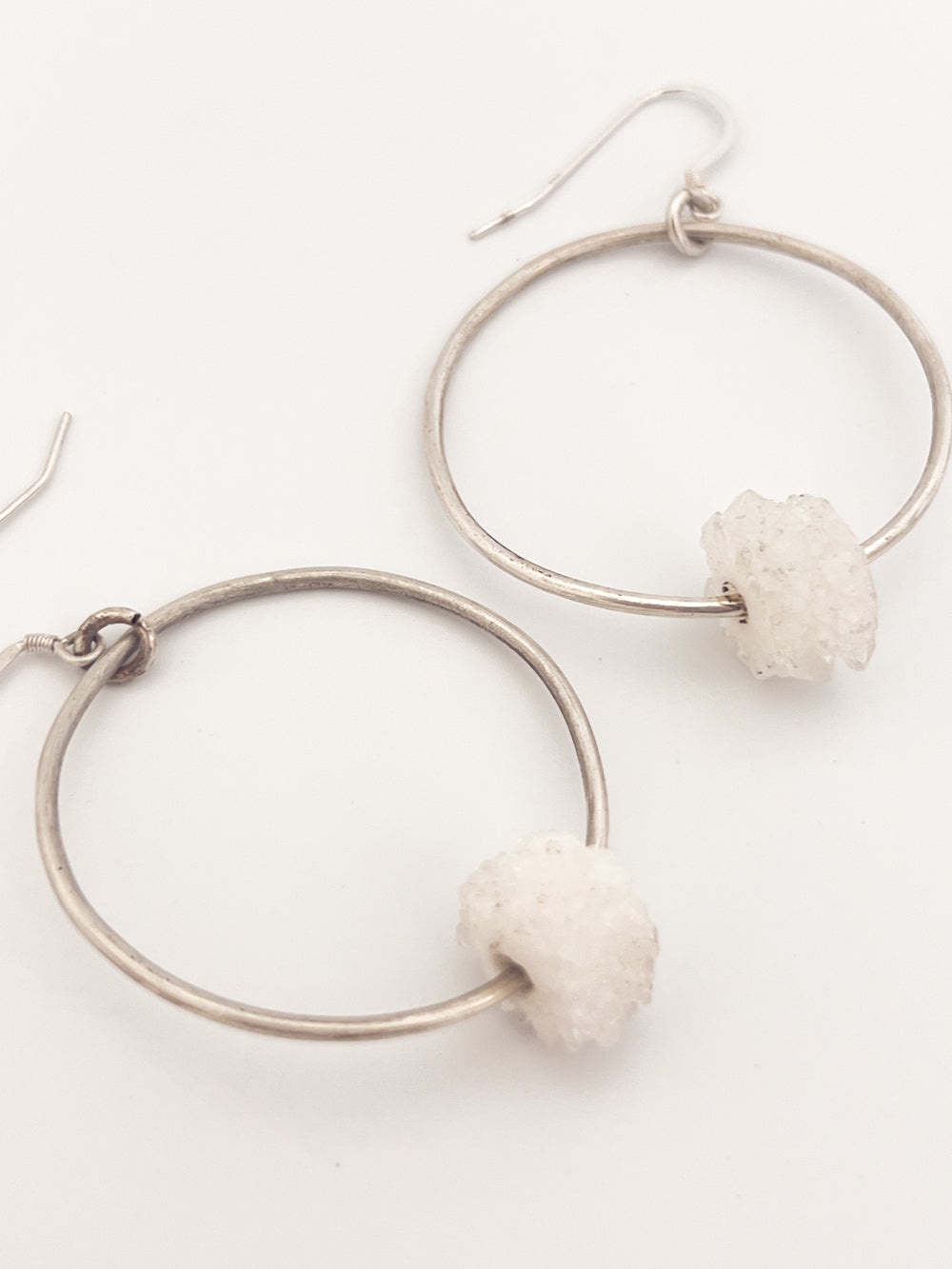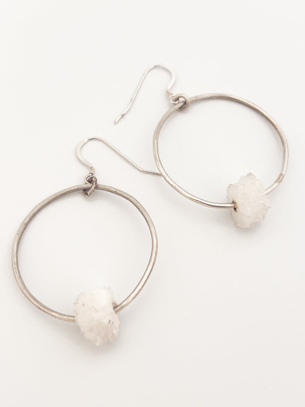 These clear quartz crystal 2" hoop earrings are made with sterling silver by luxury jeweler Cathy Miller.