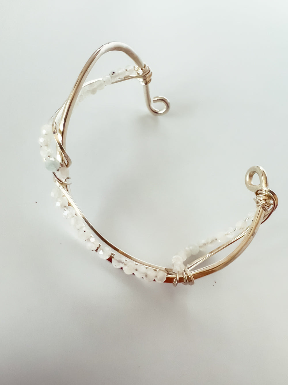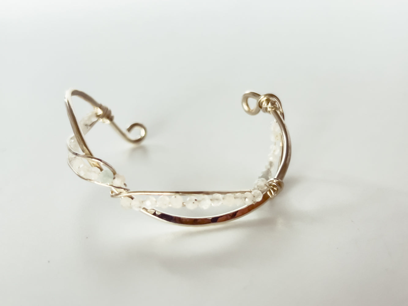Rainbow moonstone beaded sterling silver cuff bracelet handmade by local jewelry artist Jen Kish of Imaginarium Jewelry with sterling silver wire wrapping.