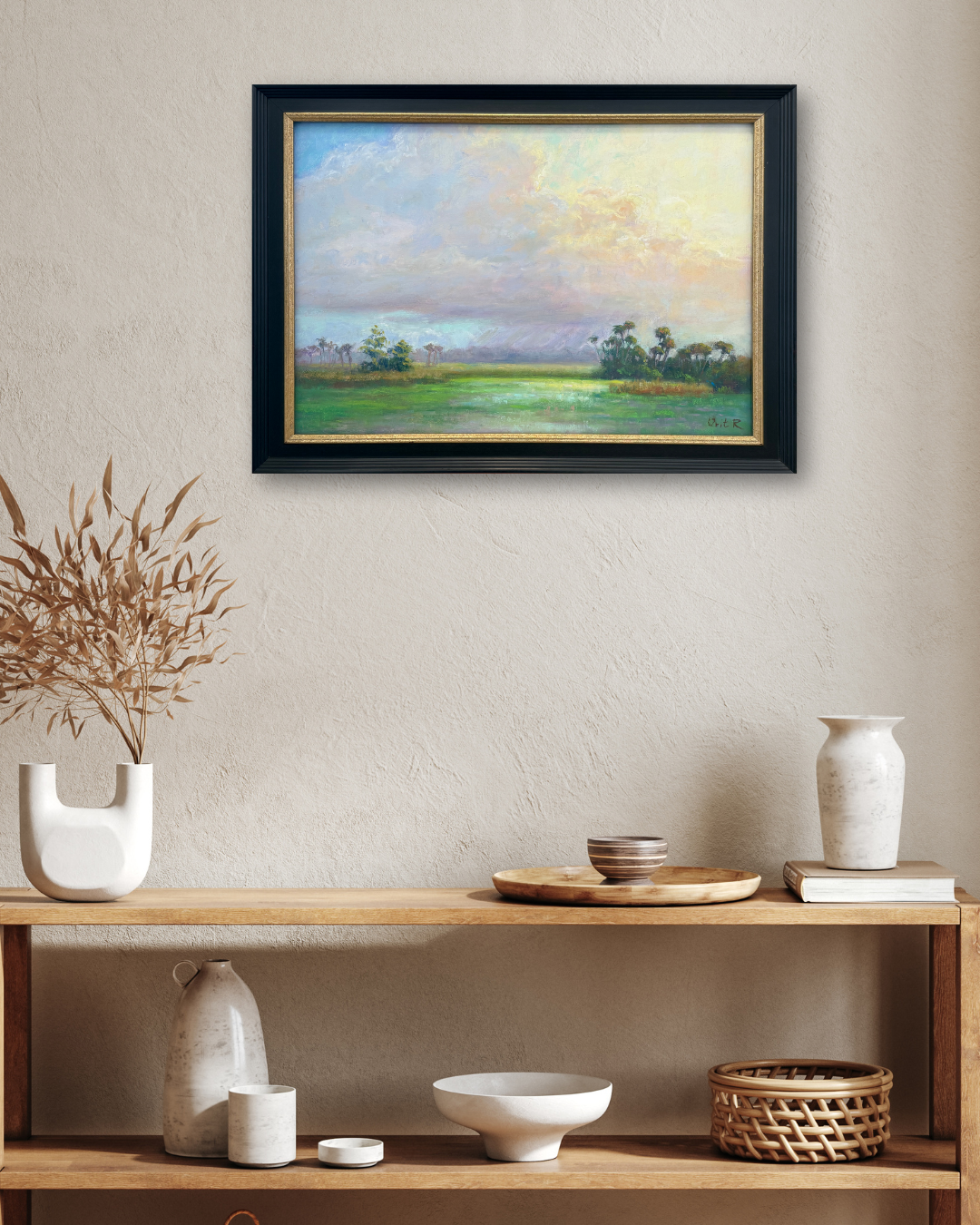 20" x 28" framed original pastel on paper Rainy Marsh Morning is by Israeli-American artist Orit Reuben. Reuben is known for her impressionistic use of pastels to focus on light and color. She is our feature pastel artist at Gallery500.