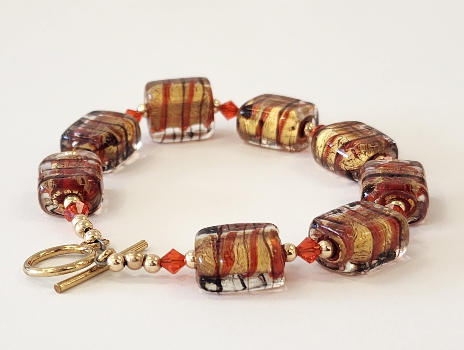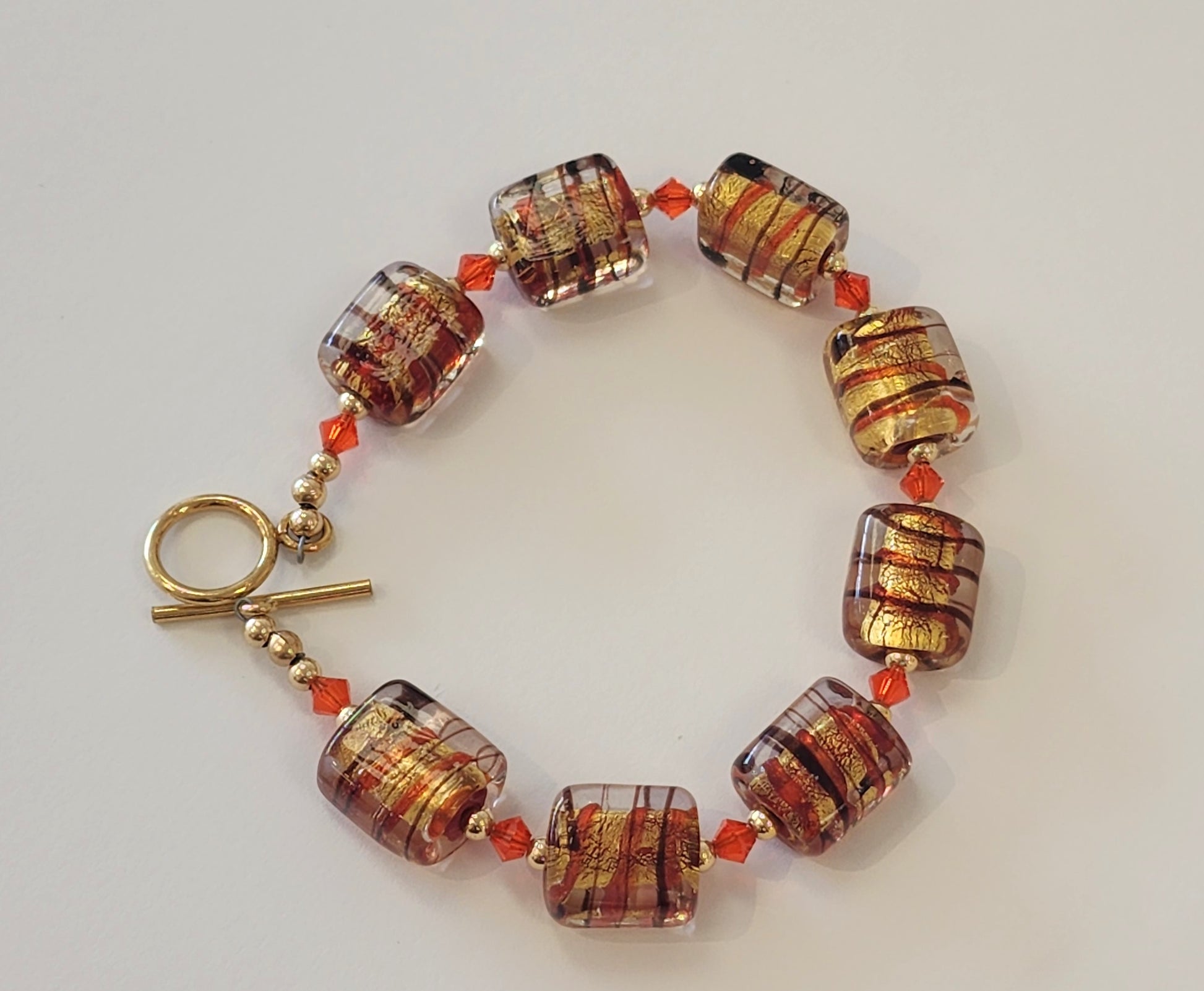 Local Jeweler Nancy Neeb's glass bracelet features high quality glass beads. The glass beads are separated by gold round spacers and red Swarovski crystals. Complete with a Gold clasp, approximately 9" in length. Resizing is available.