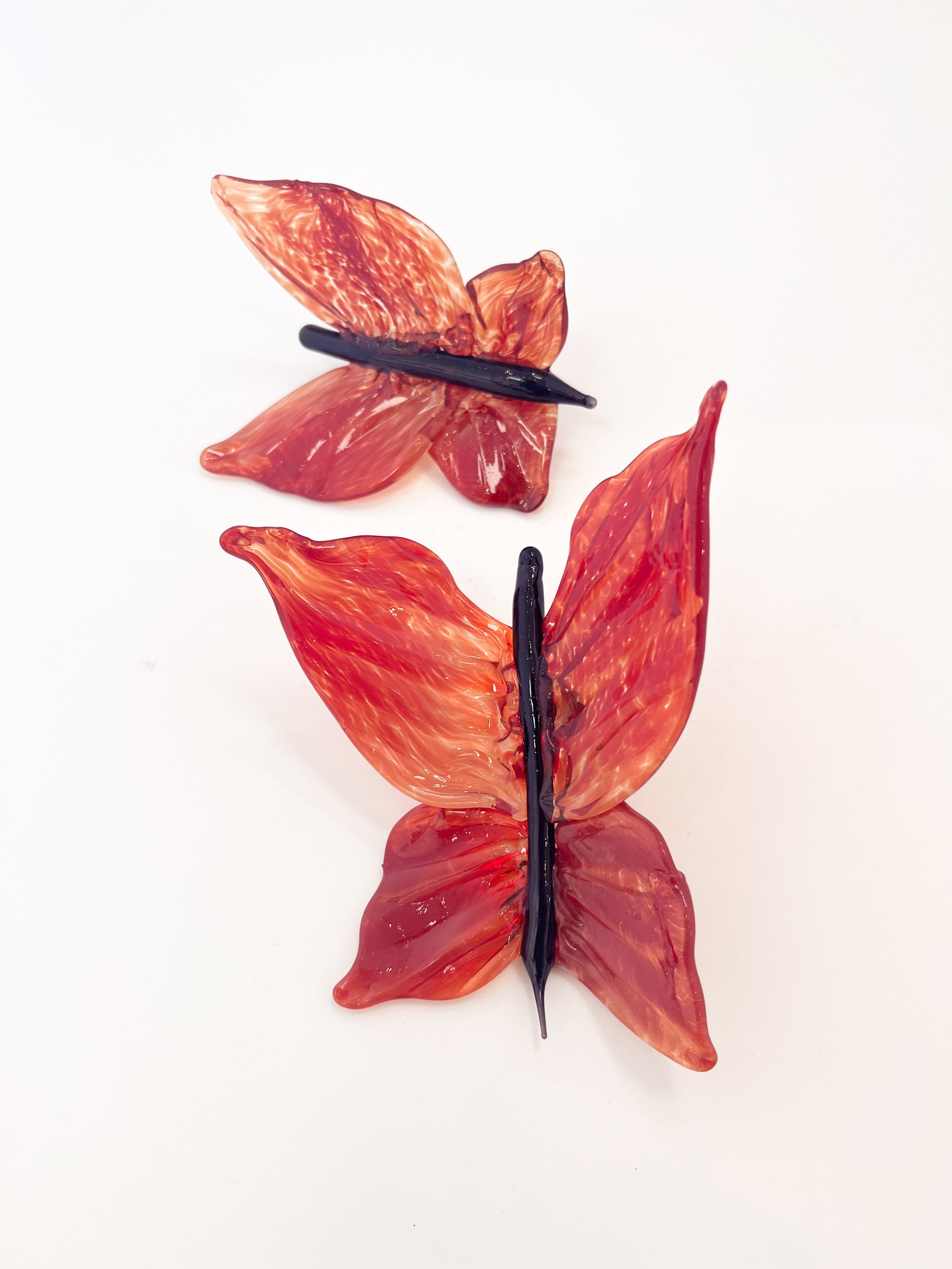 Red-orange glass-blown butterfly that mounts to wall by artist Tim McFadden.