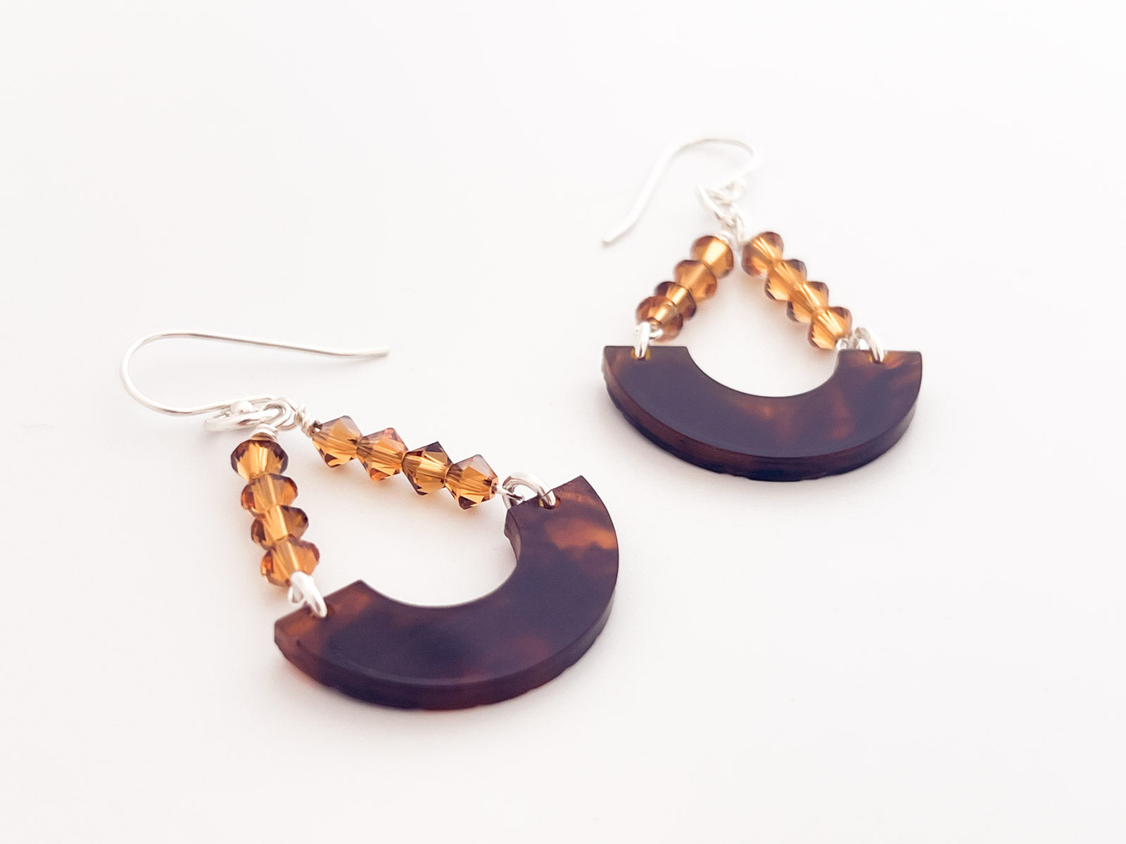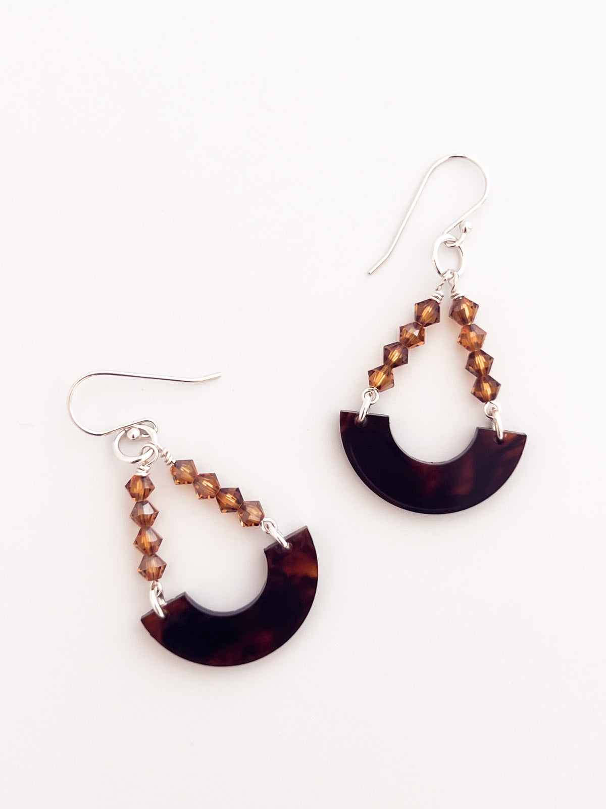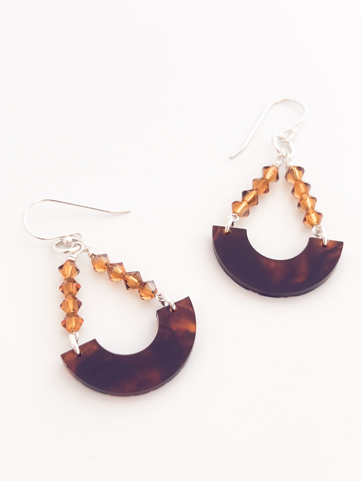 Tortoise shell look resin in half circle complimented with golden brown 4mm Swarovski crystal beads to connect both sides to sterling silver jump rings. Sterling ear wires. Approximately 1.75" long