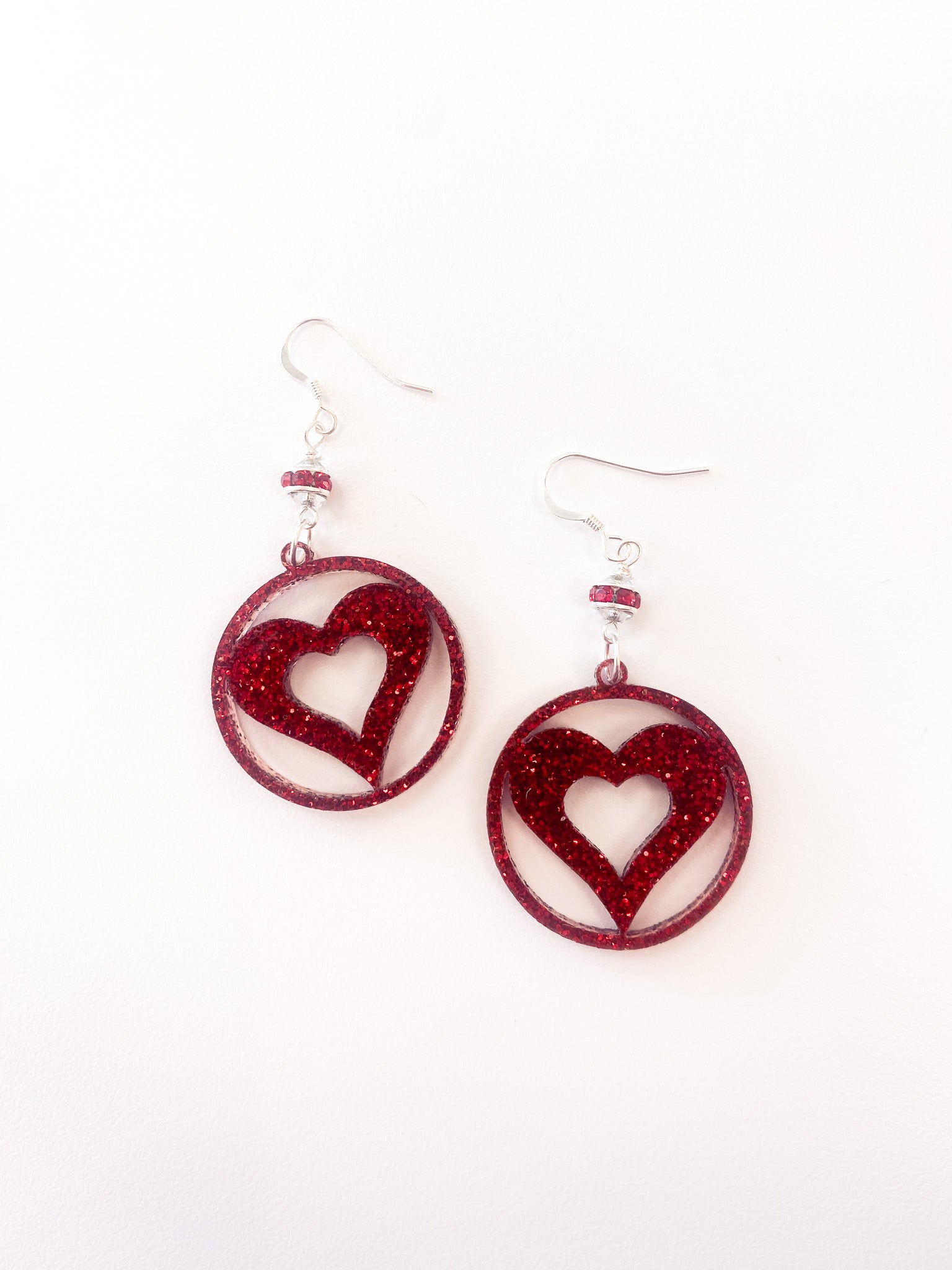 Resin heart earrings by Nancy Neeb. Made with red sparkle resin, Neeb adds Swarovski crystals to create one of a kind earrings.