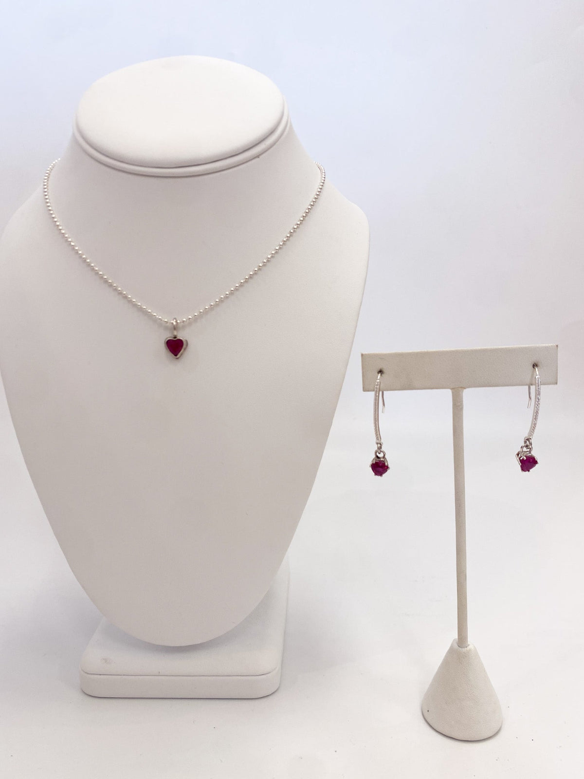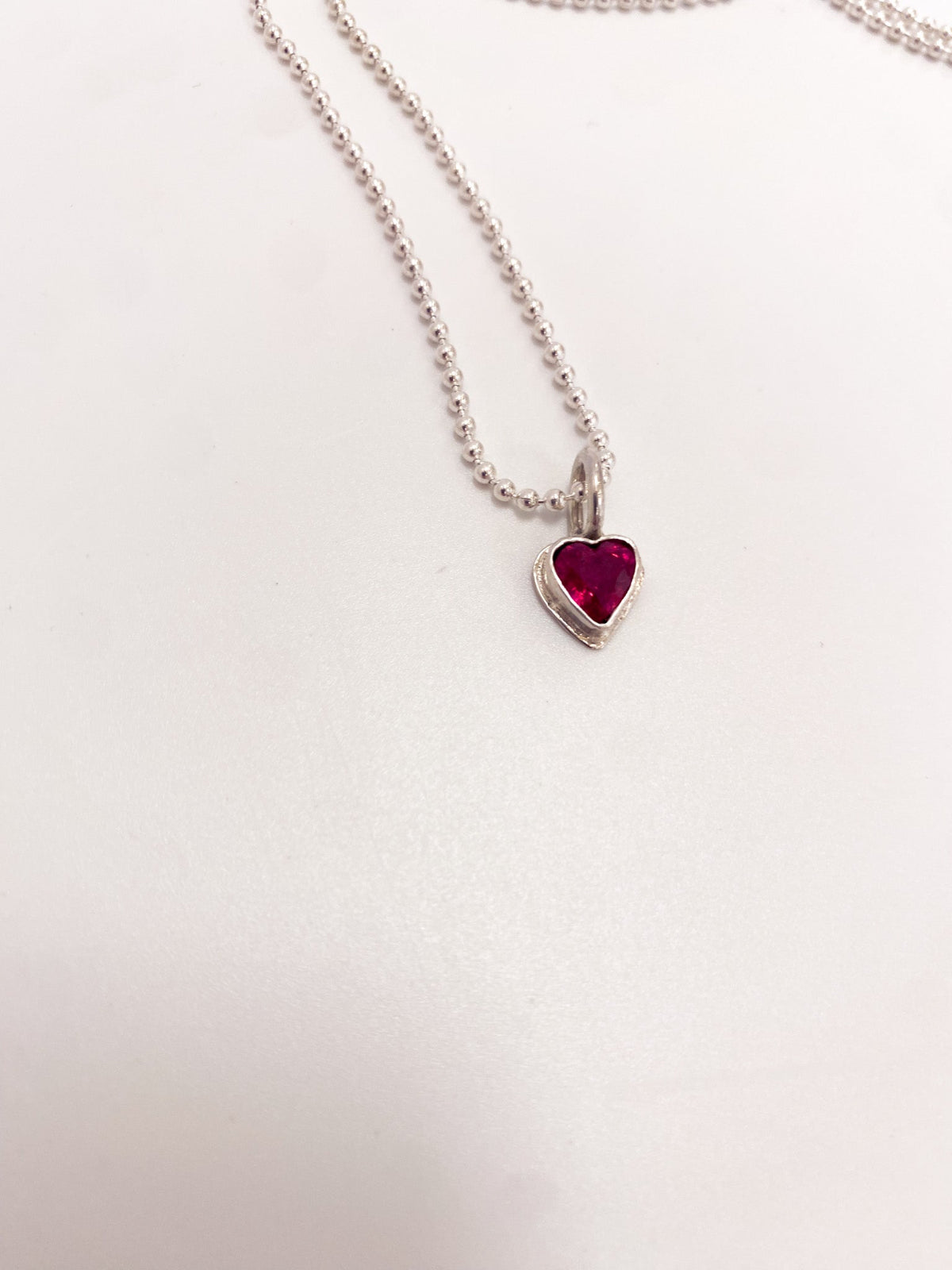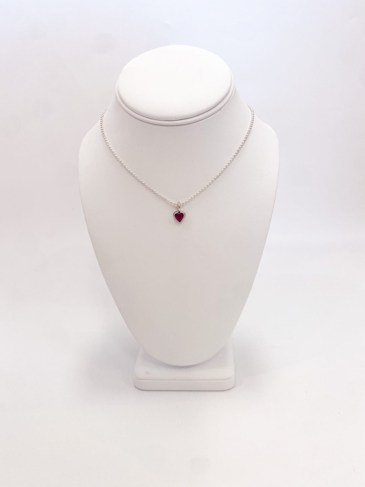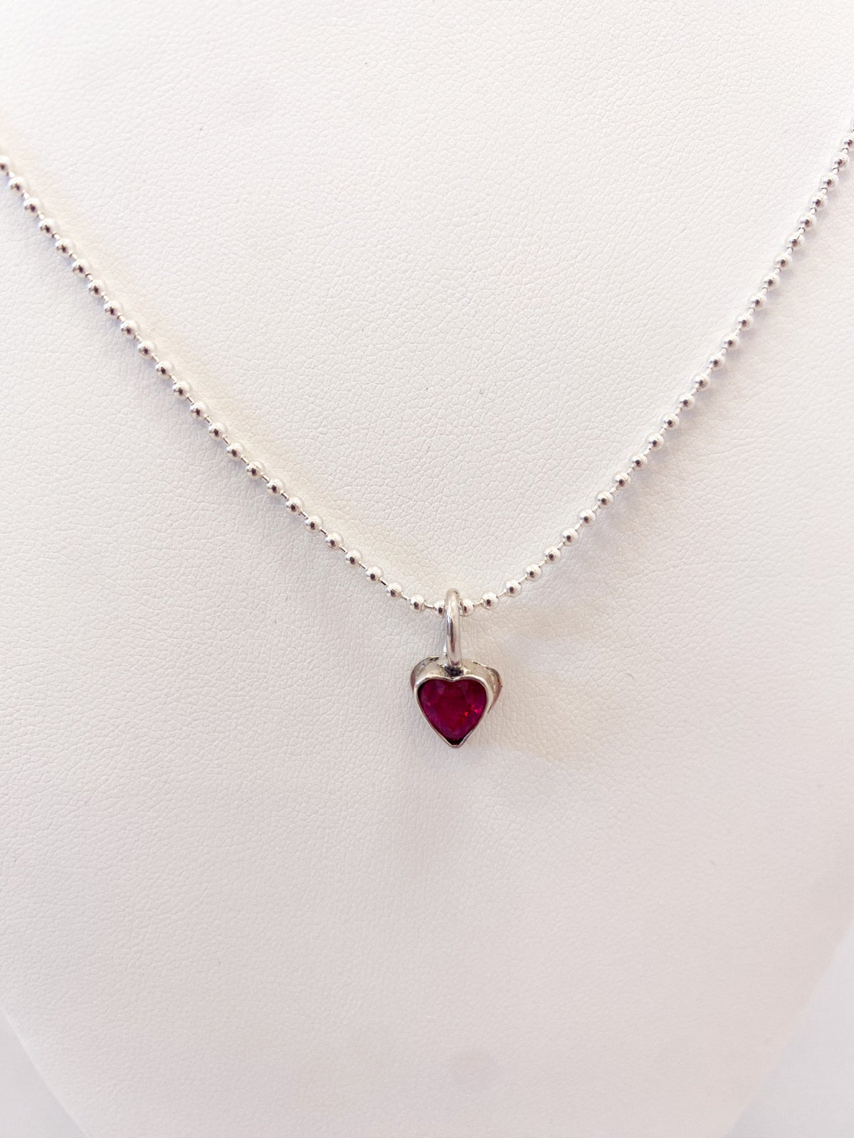 6 mm natural Ruby heart pendant by jeweler Cathy Miller. The bezeled Ruby heart is set in sterling silver and on a 18" sterling silver beaded chain. The necklace is a perfect match for Miller's ruby heart earrings.