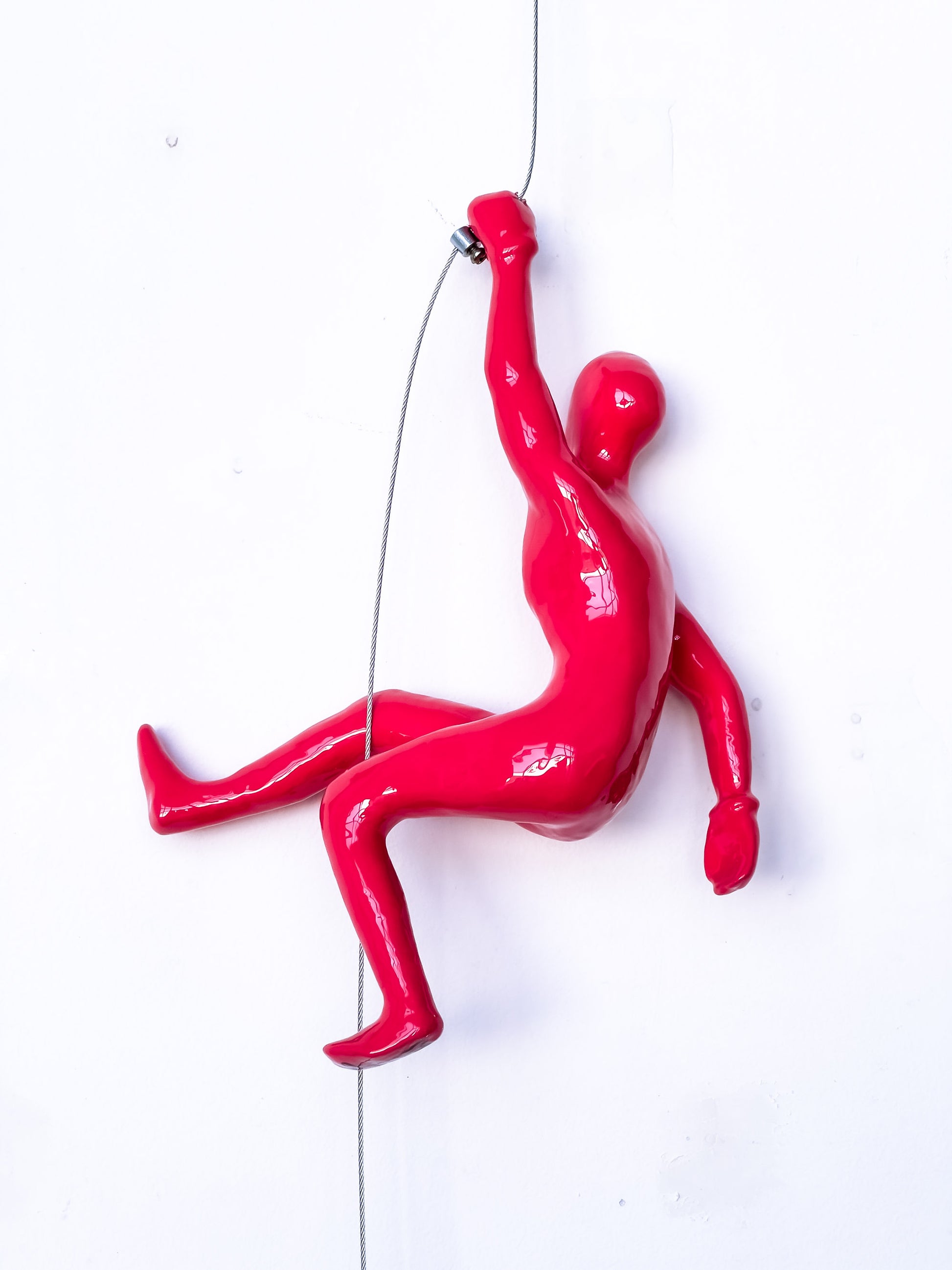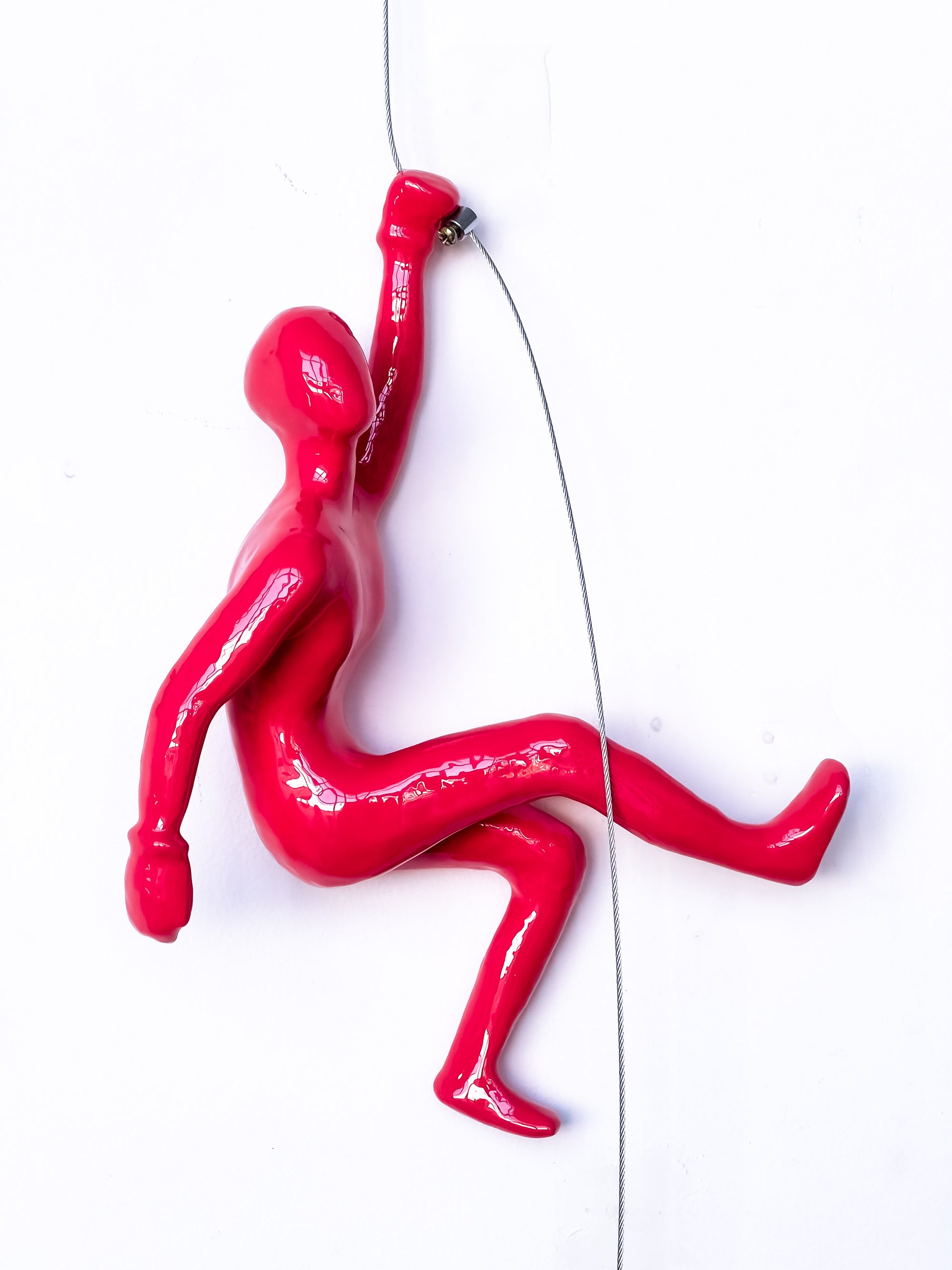 Ancizar Marin, 10 x 4.5 x 6 inch fiberglass, volcano rock and bronze sculptures finished with forest automotive paint. This piece is hand crafted and represents a rock climber or acrobat climbing up or repelling from the surface of the wall.