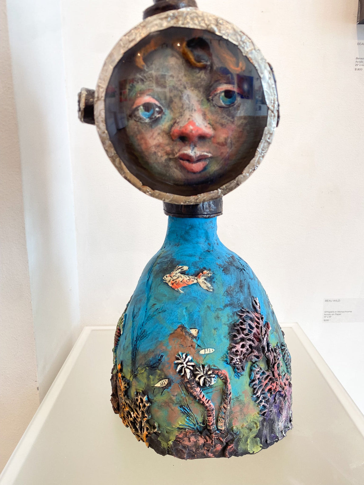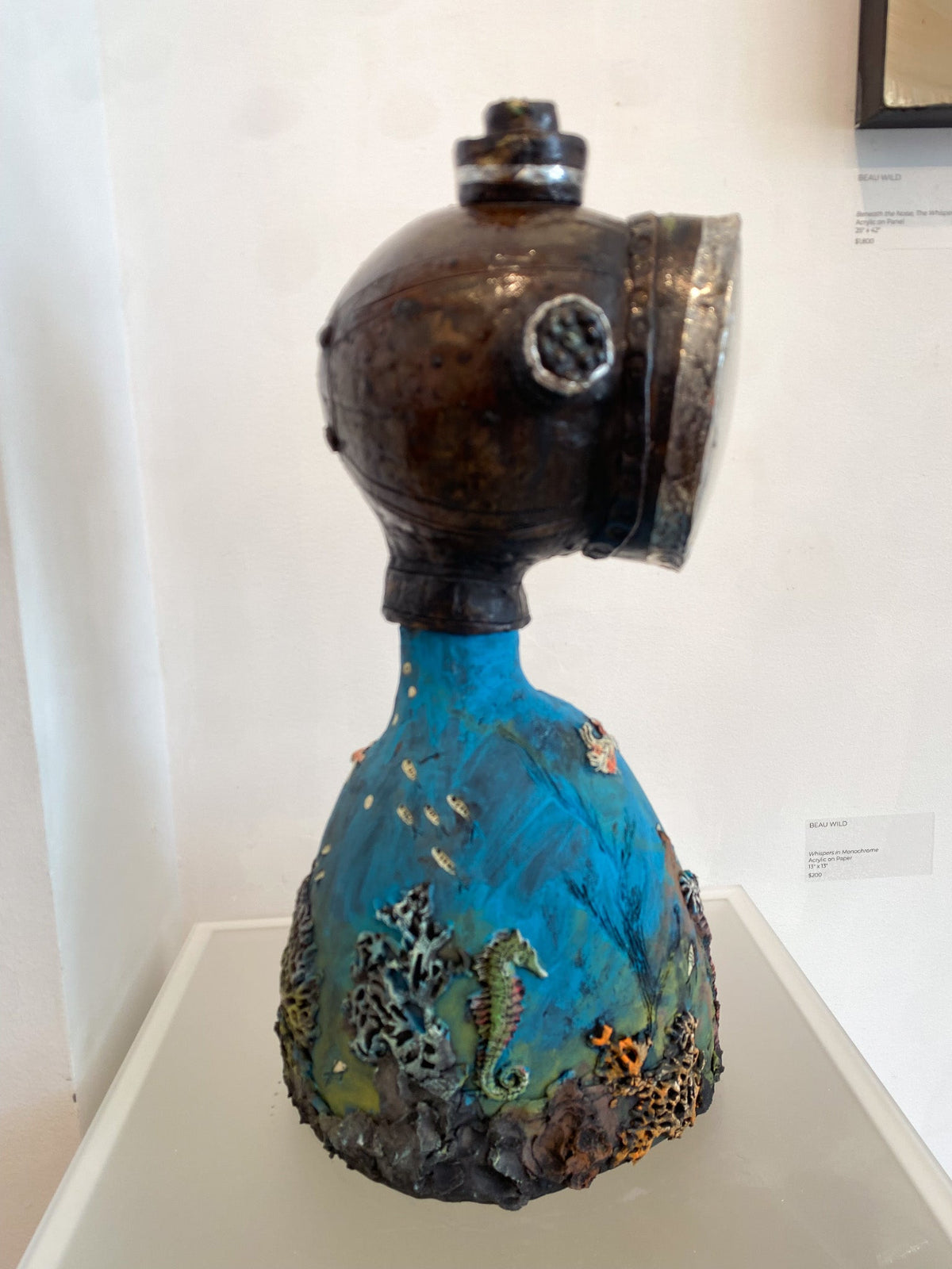 20" x 13" x 13" clay scuba diver sculpture by Julie Latayan. Complete glass mask, Latayan's sculptures have a whimsical and life-like nature.