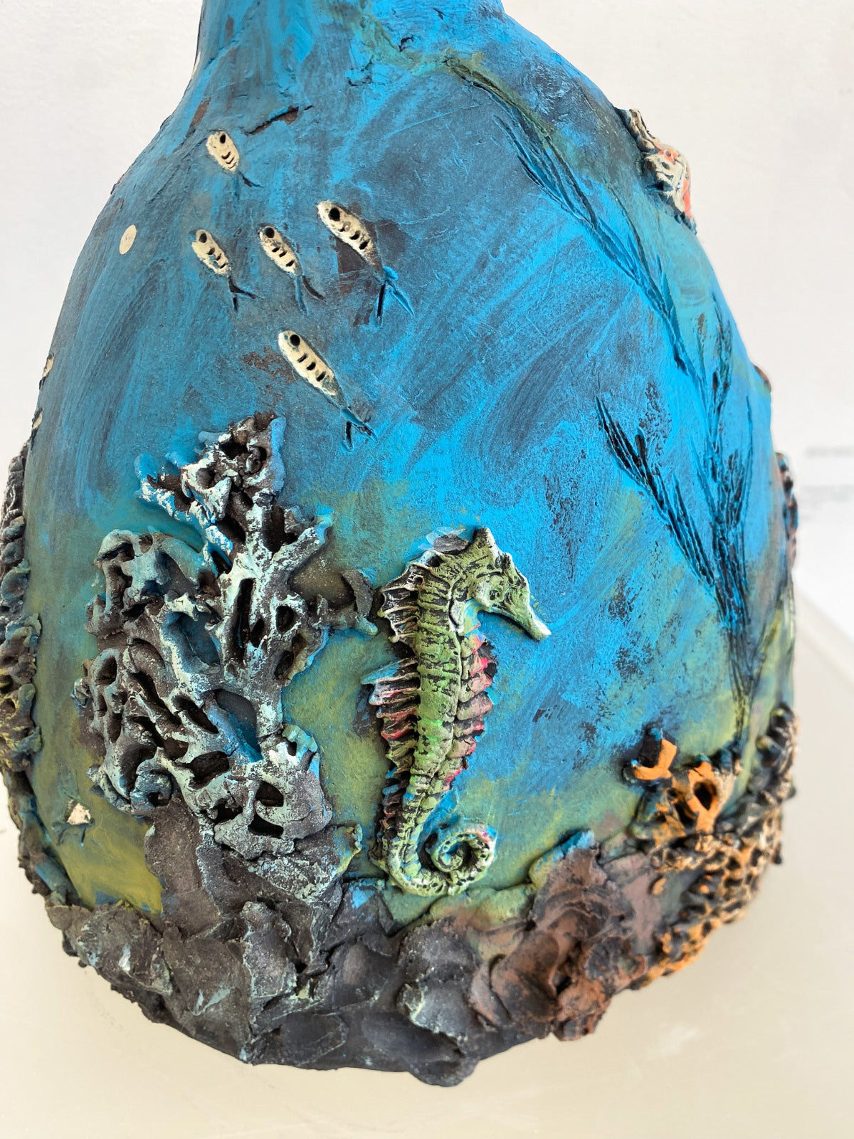 Julie Latayan merges sculpting and painting in her work, finishing her ceramic sculptures in acrylic paint. Her inspiration come from the rich diversity of humanity’s quirks and emotions. Julie feels a heartbeat in every piece of clay and works to bring it to life in a clever and unique way.