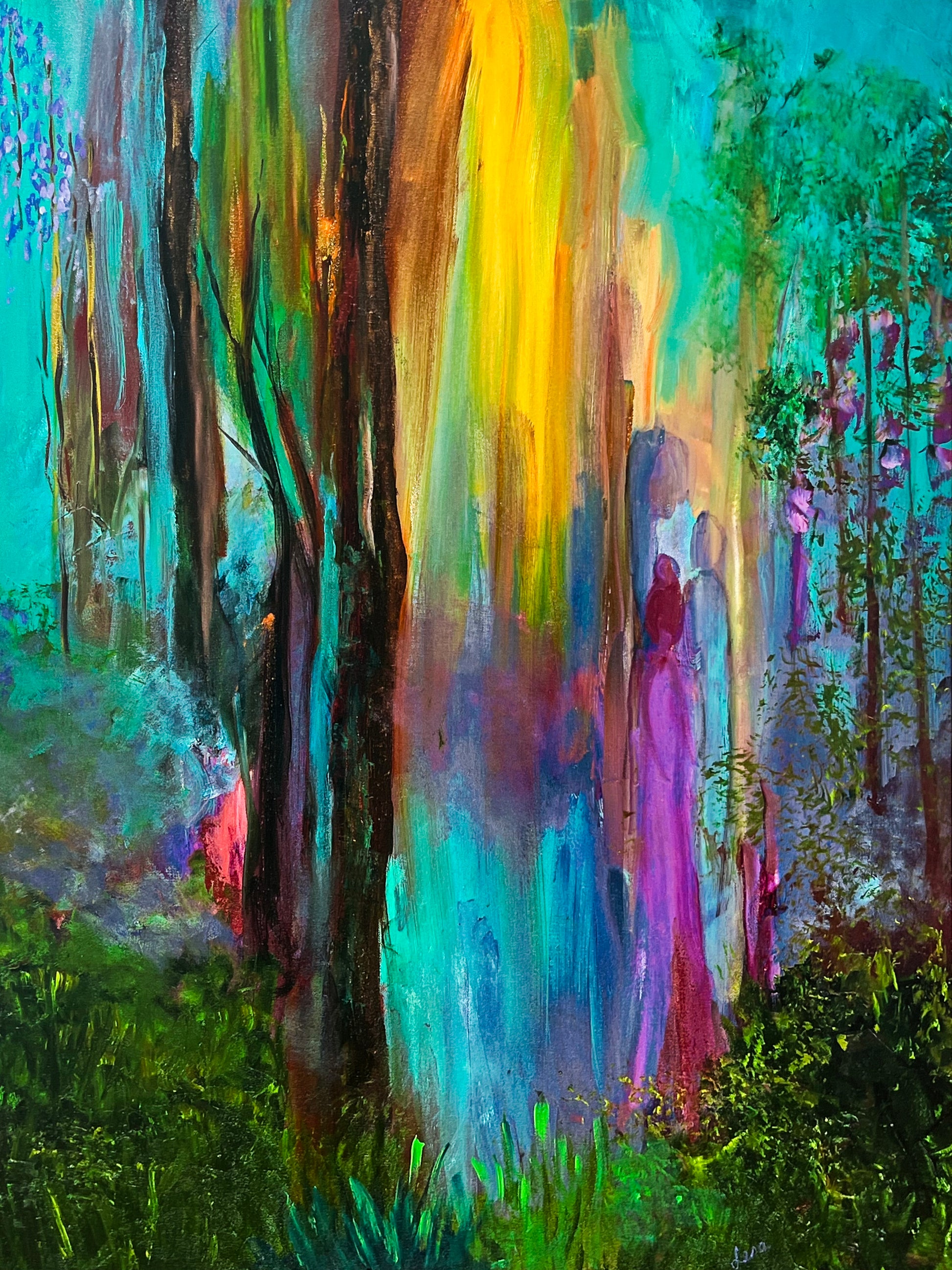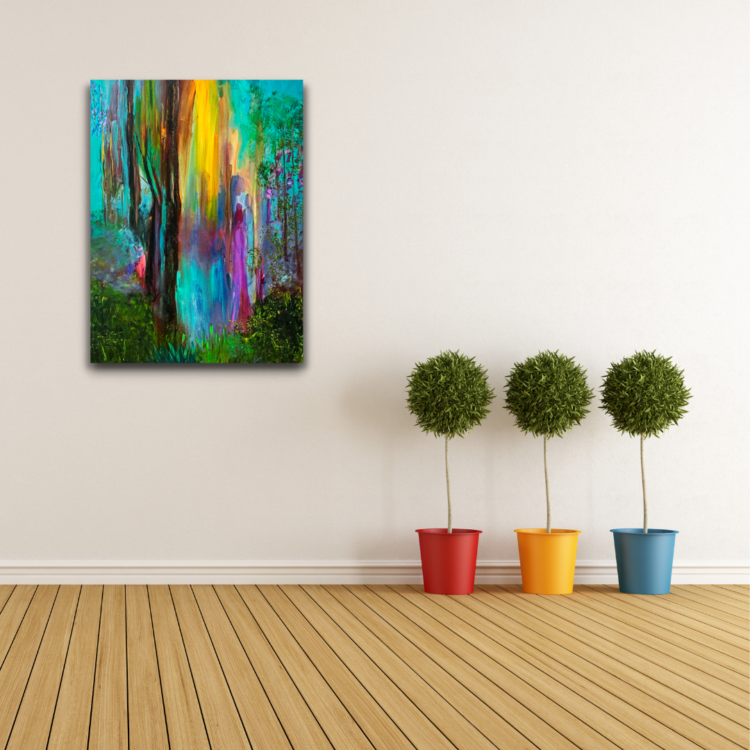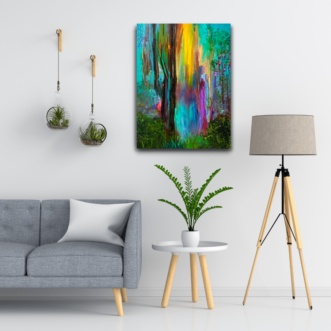 30" x 40” giclée on Canvas by Lesa Kennedy. Lesa considers herself a novice but her work has attracted a diversity of collectors. In this work, Lesa depicts abstract and colorful forest scene.