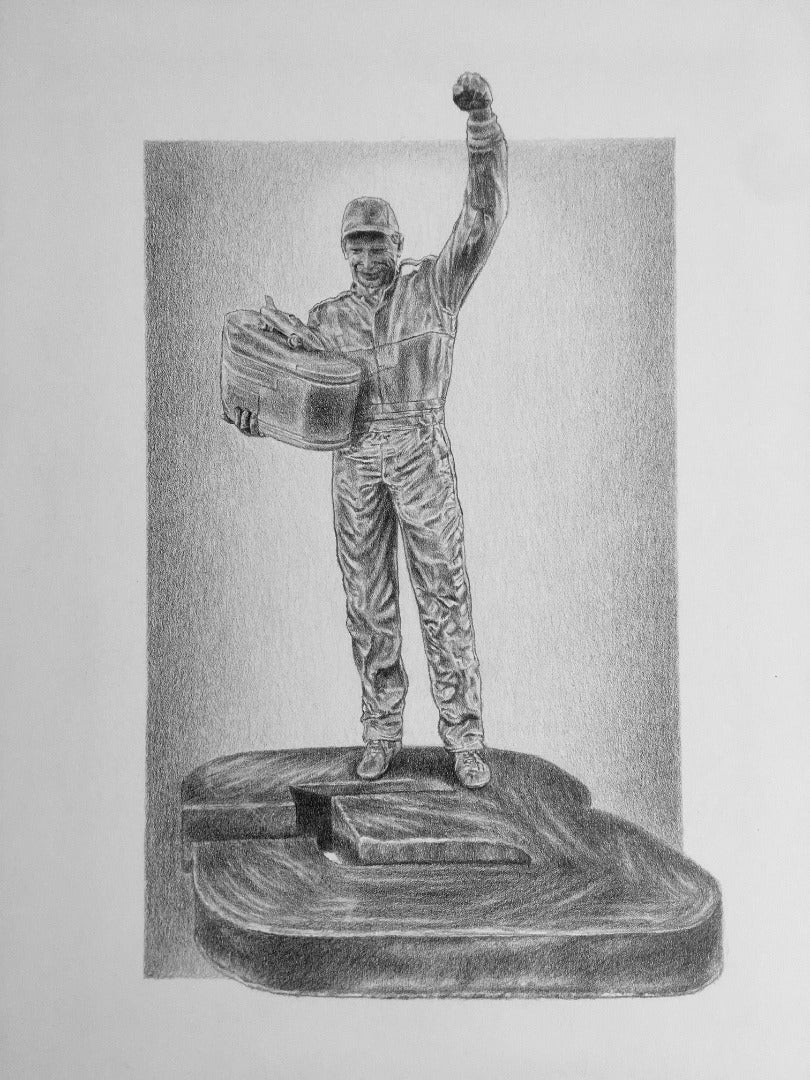 11" x 14" Sketch of the Dale Earnhardt Sr. statue at the Daytona International Speedway. Earnhardt Sr. was killed in a crash during the final lap of the Daytona 500 in 2001. The Daytona International Speedway hosts this memorial to the famed NASCAR racer, originally unveiled in 2002. In the statue, Earnhardt Sr. stands on his number 3, holding the winners trophy he received for his victory at the 1998 Daytona 500.