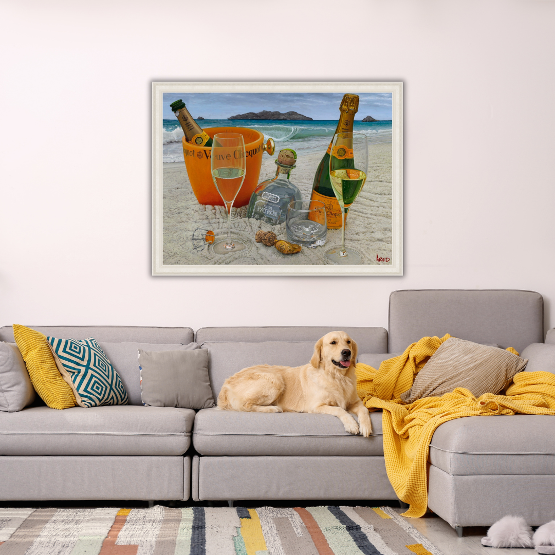 Drawing inspiration from some of his favorite destinations, Thomas Arvid brings us to a place we all know and love: “Somewhere on a Beach.” Arvid recounts that he conceptualized the painting in the Exumas, one of his favorite destinations. But he used the soft white sand of the Florida Panhandle for the beach, and inspired by his home-away-from home, he painted the blue water and sherbet skies of Maui. By incorporating the best of his favorite beaches, Arvid brings us a composition that is immediately familiar, and we can feel the stress melt away because there is literally nothing better than being “Somewhere on a Beach.”